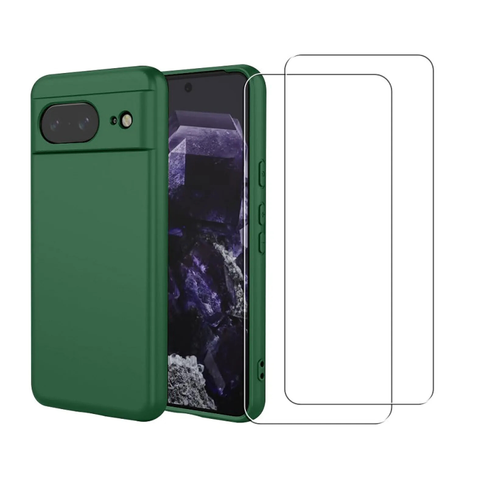 Pack coque anti-choc silicone liquide verte + 2 verres trempés, offrant une protection intégrale compatible avec votre Pixel 8 les chocs, les rayures et la poussière. Kit de nettoyage et d'installation inclus.