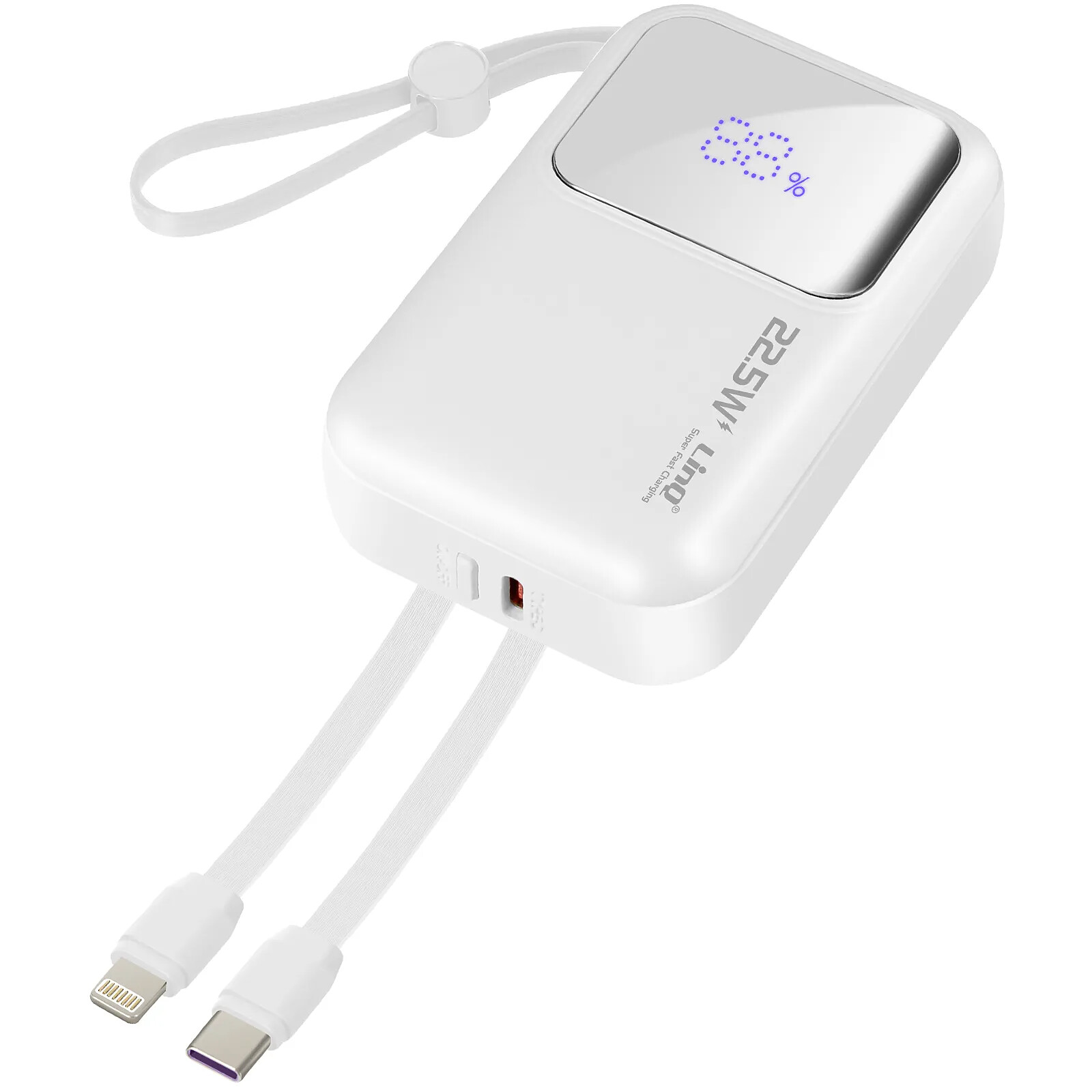 Batterie de Secours 10000 mAh. Compatible avec Power Delivery 20W et Quick Charge 22,5W. Trois câbles intégrés incluant un câble Lightning, un câble USB-C, et un câble USB. Affichage LED clair. Câble USB multifonction qui peut être utilisé pour recharger la batterie externe et comme lanière. Design compact et léger.