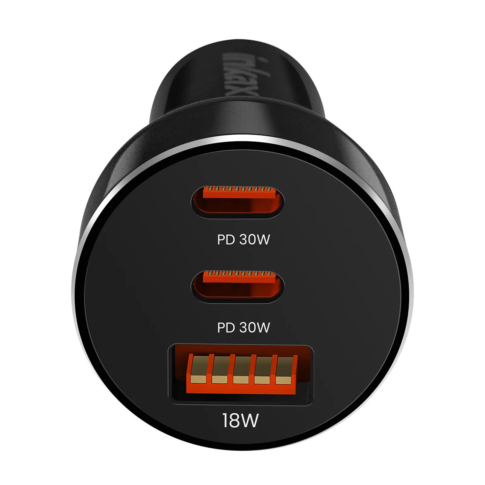 Chargeur voiture de chez Inkax, conçu avec 2 ports USB-C de 30W chacun et un port USB de 18W pour charger vos appareils lors de vos trajets
