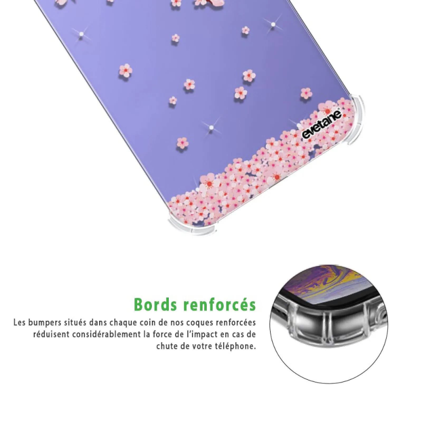 PROTECTION ANTICHOC RENFORCÉE AUX ANGLES : La coque protège l'arrière et les côtés de votre téléphone. Comme les Smartphones tombent plus fréquemment sur les coins, les angles sont renforcés, pour une protection antichoc idéale. Les angles sont incurvés pour protéger la vitre avant. La matière haute résistance est à l'épreuve des chocs, mais aussi des rayures et des poussières.