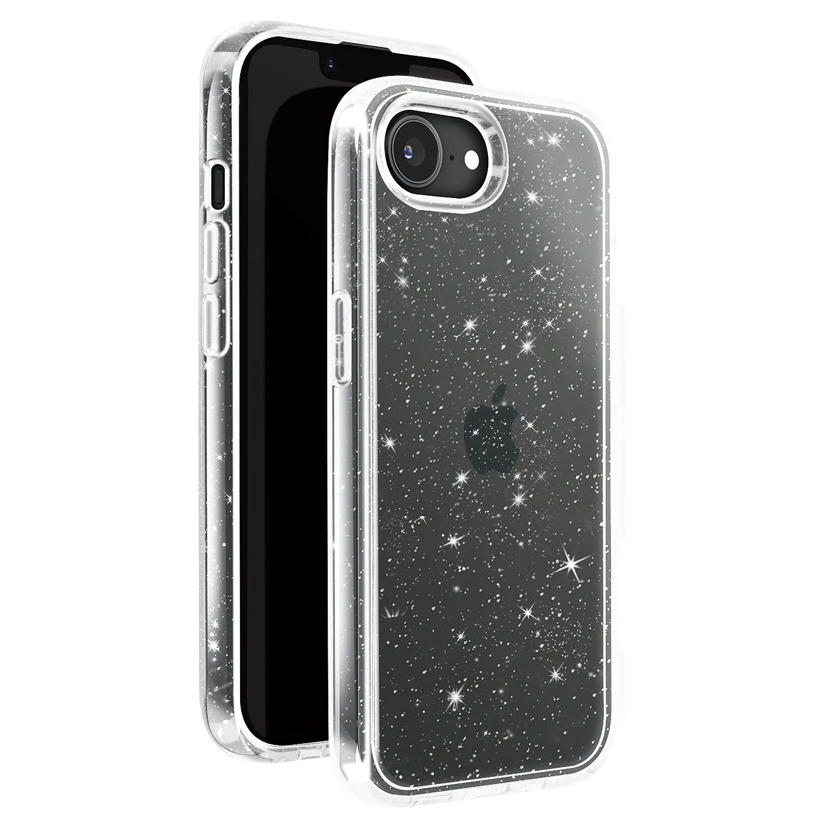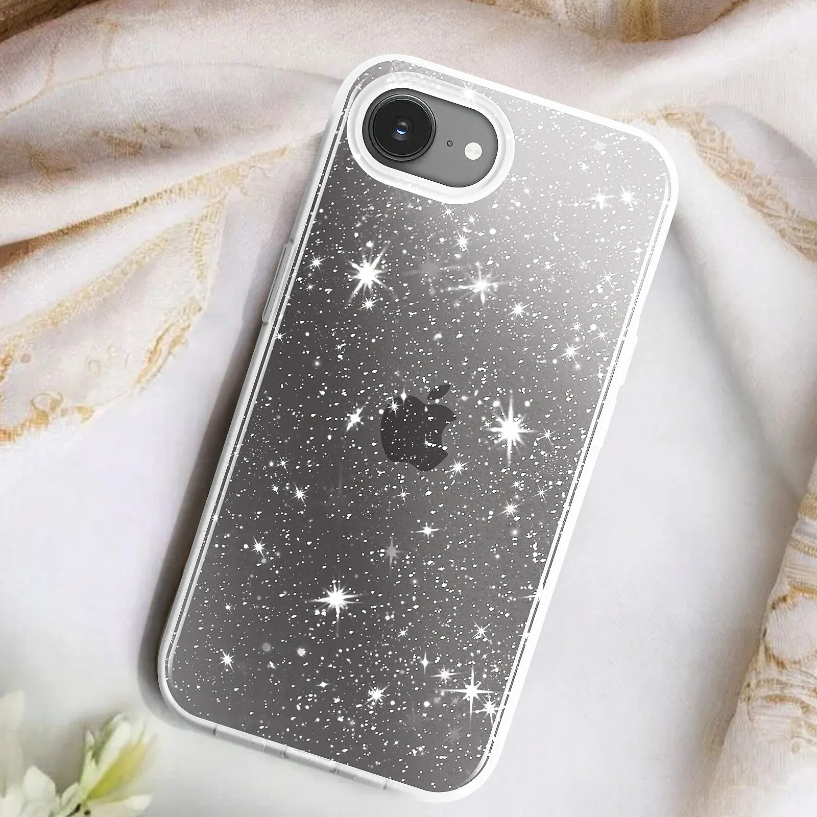 Coque pour iPhone 16e avec paillettes brillantes Blanc pour un éclat scintillant. Conception triple couche en silicone + polycarbonate, résistant aux rayures et chocs. Bords surélevés pour protéger l'écran et la caméra. Design léger. Découpes exactes pour un accès facile aux ports.