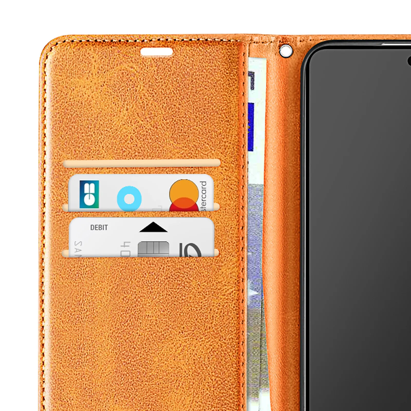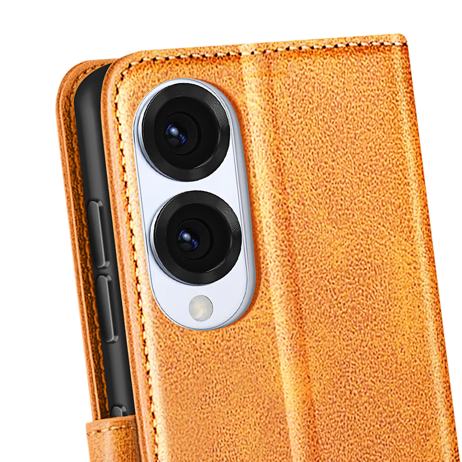 Étui pour Samsung Galaxy S25 Edge. Clapet Portefeuille Jaune en cuir vegan élégant. Housse à rabat pliable en support vidéo. Compartiment pour cartes et billets. Dragonne intégrée. Protection Antichoc et anti-rayures. Design raffiné.