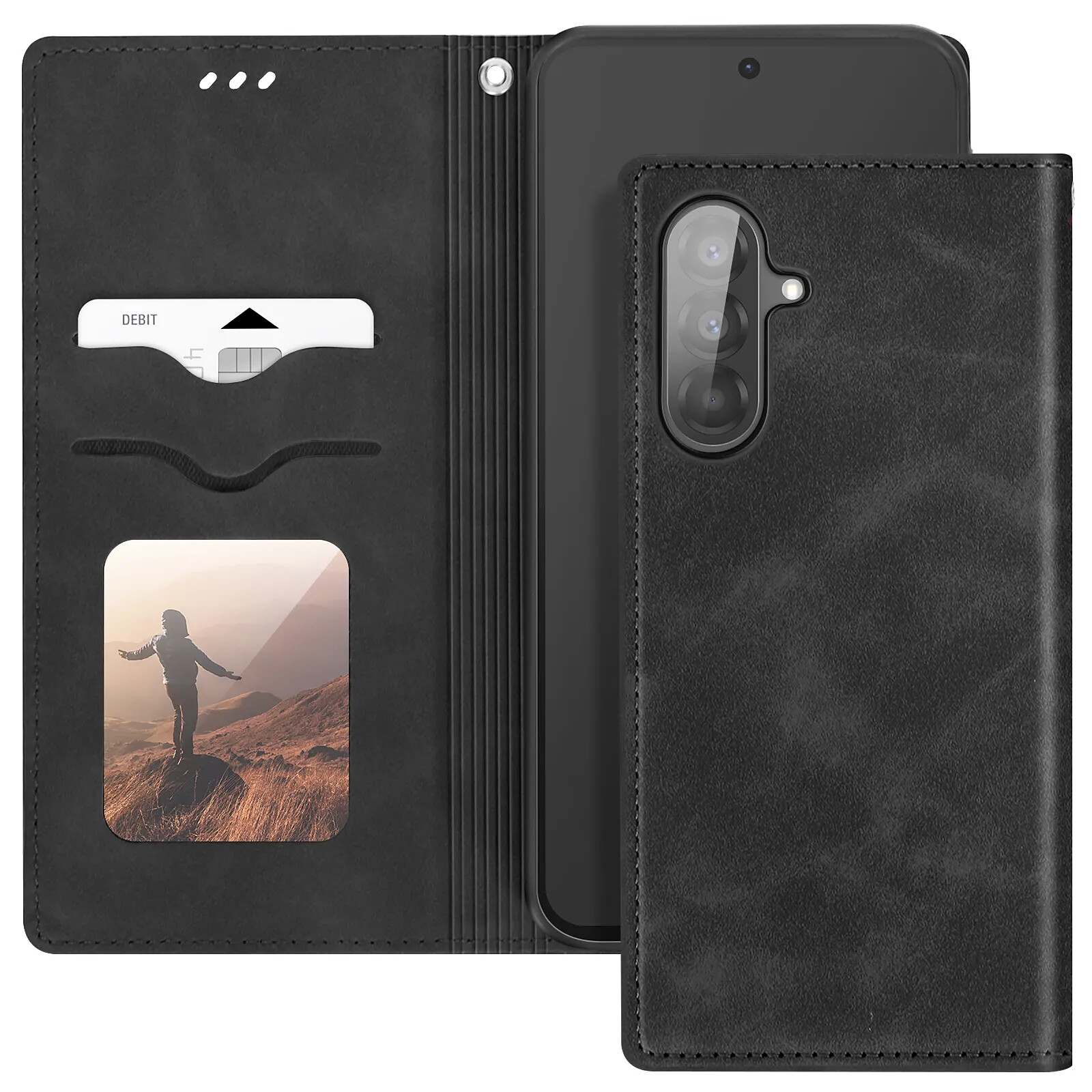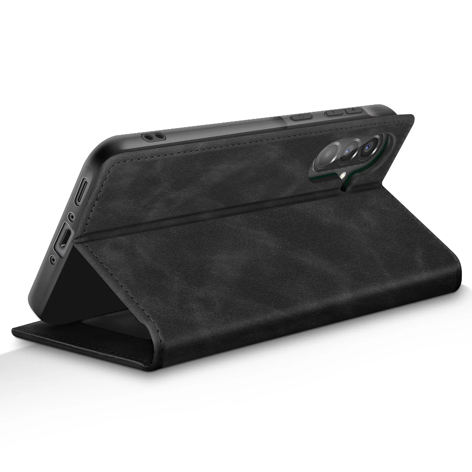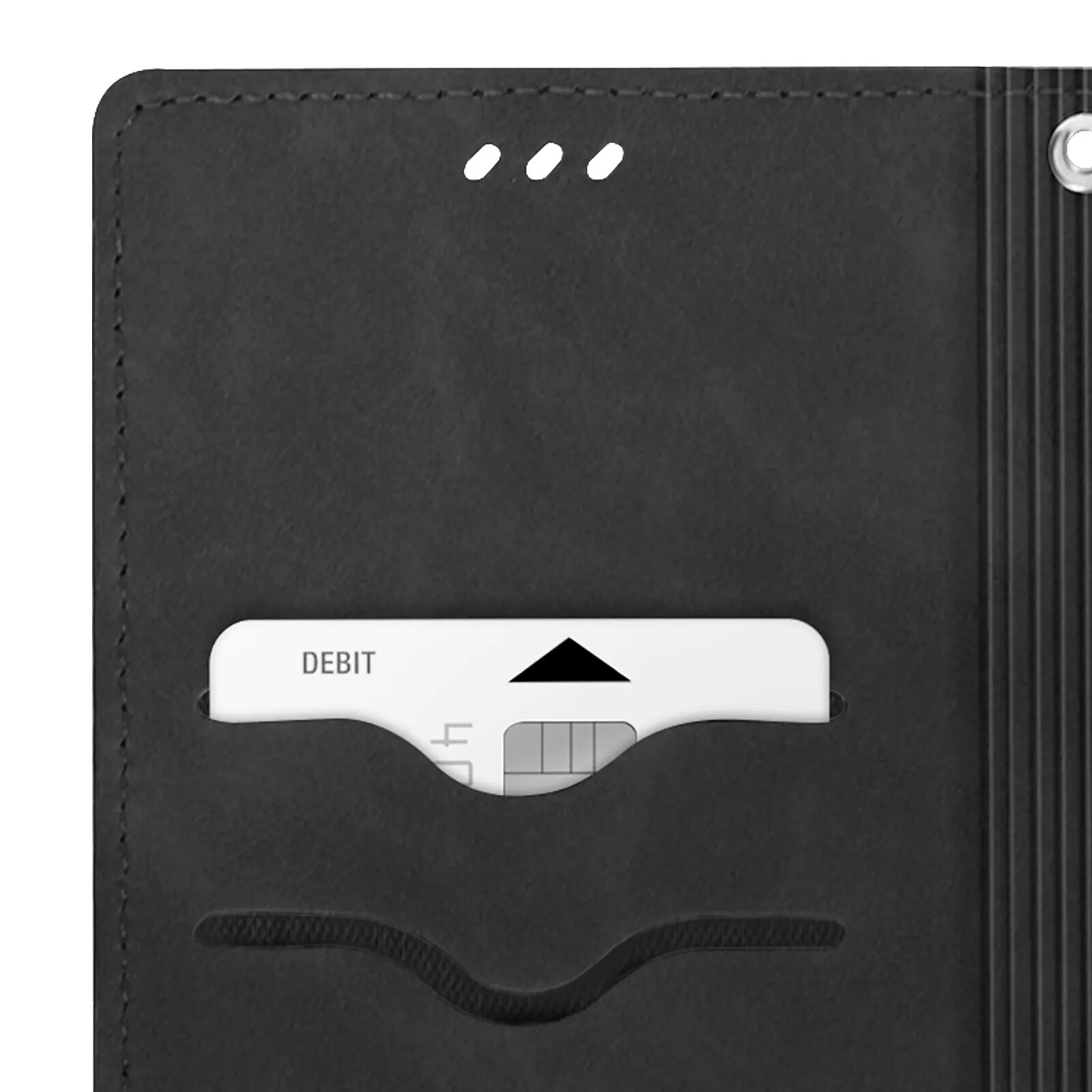 Housse pour Samsung Galaxy A56 assurant une protection intégrale. Deux rangements pour cartes. Fonction support vidéo. Revêtement en cuir vegan Noir effet vieilli. Clapet magnétique. Coque interne en silicone gel. Découpes au niveau de l'haut-parleur frontal.