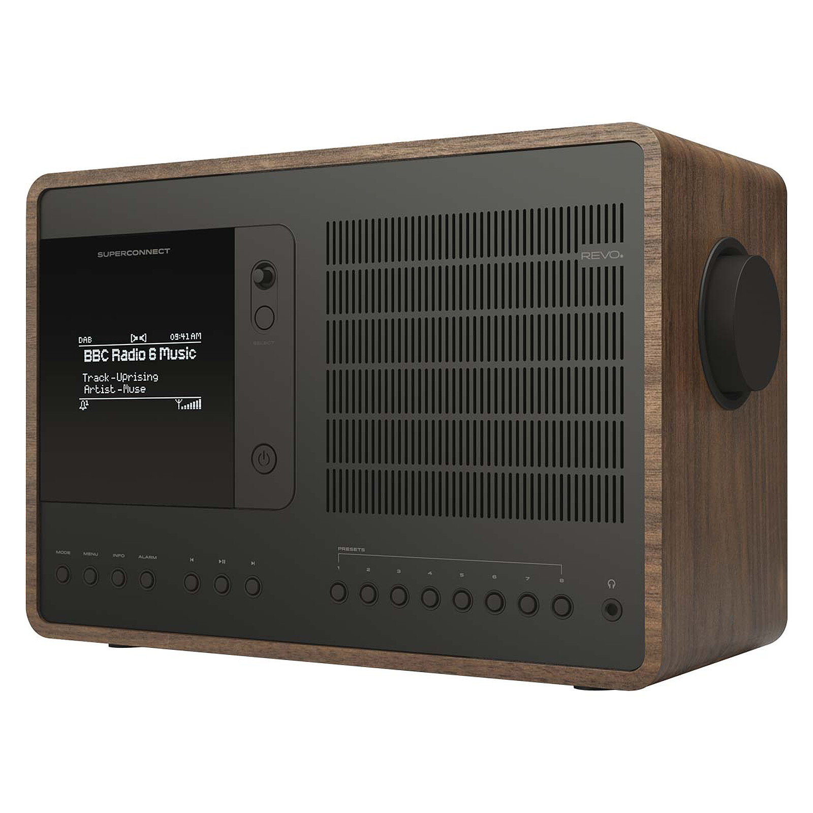 Conçue par Revo la radio SuperConnect est équipée pour recevoir une large gamme de stations de radio, notamment DAB, DAB+, FM avec RDS et radio Internet Wi-Fi. Elle vous donne accès à plus de 36 000 stations de radio du monde entier. Sa capacité à communiquer avec des appareils et des services externes est inégalée, car en effet elle est équipée de la technologie Bluetooth qui vous permet de profiter de tous les avantages du streaming de qualité CD à partir de votre smartphone ou de votre tablette. Vous pouvez facilement avoir accès aux plateformes de streaming telles que Spotify Connect, Amazon Music et Deezer. Pour vous permettre de suivre vos stations de radio favorites, la SuperConnect est dotée d'un superbe écran graphique OLED et d'un joystick de pilotage qui ajoute une vraie touche de modernité. L'électronique audio brevetée et la technologie du haut-parleur DMR à diaphragme qui équipent également la SuperConnect délivrent 15 watts de son mono numérique clair avec des basses profondes et riches.