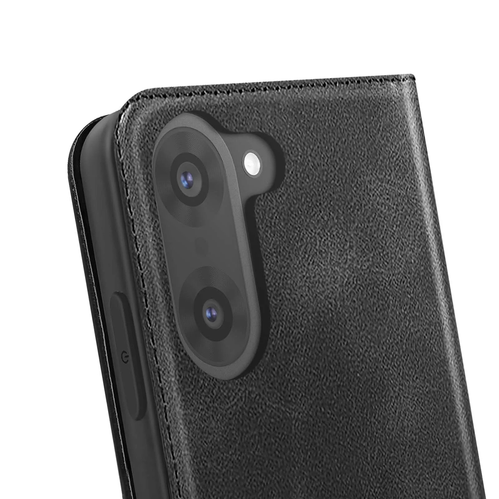 Sublimez et protégez votre OnePlus Nord CE5 avec cet étui folio au design vintage en similicuir noir. Il combine élégance et praticité grâce à un support vidéo intégré et des rangements pour cartes. Sa fermeture magnétique sécurise l'ensemble, tandis que la coque intérieure en silicone gel souple amortit les chocs. Ainsi, il permet un accès complet aux fonctions du téléphone.