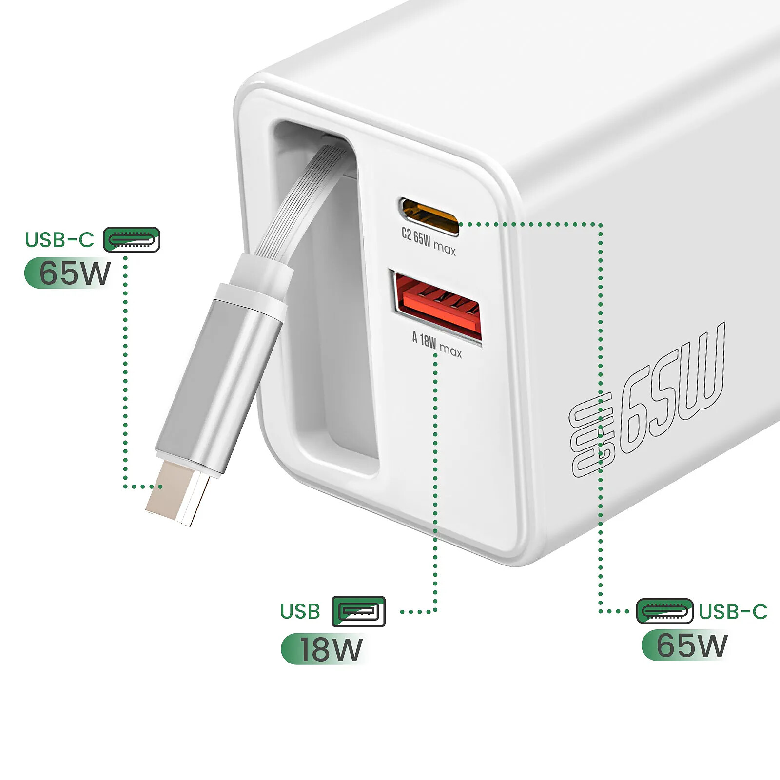 4smarts Chargeur de Voyage 3-en 1 GaN 65W avec Cable Intégré Double Port USB-C et USB Blanc