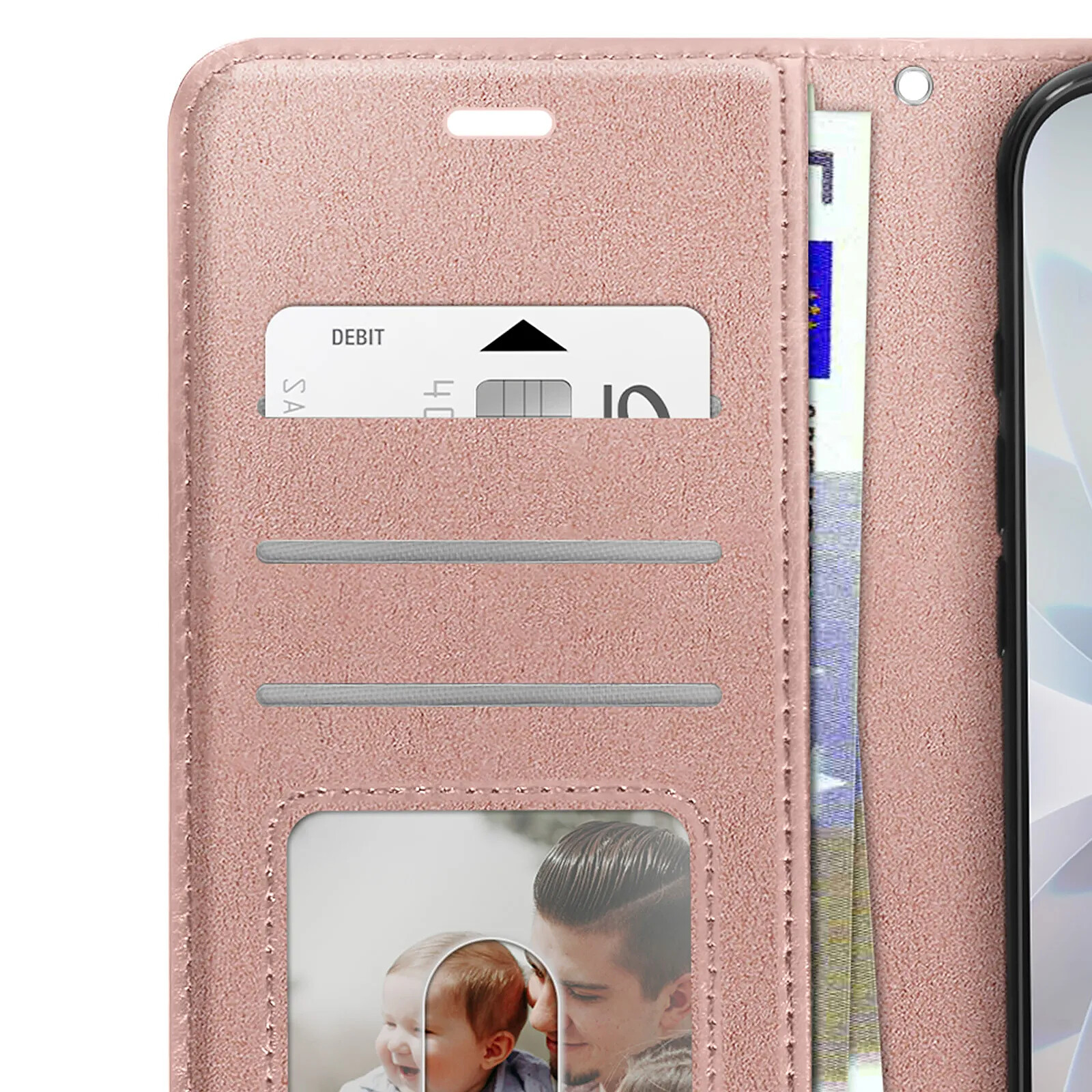 Cet étui portefeuille rose doré pour iPhone 17, signé Mayaxess, associe un revêtement grainé et satiné à une conception pratique pour un usage quotidien. Le rabat intérieur intègre trois fentes pour cartes, une poche transparente pour photo ou pièce d'identité et un compartiment latéral pour billets. La coque interne en TPU souple protège le smartphone et la dragonne amovible facilite la prise en main.