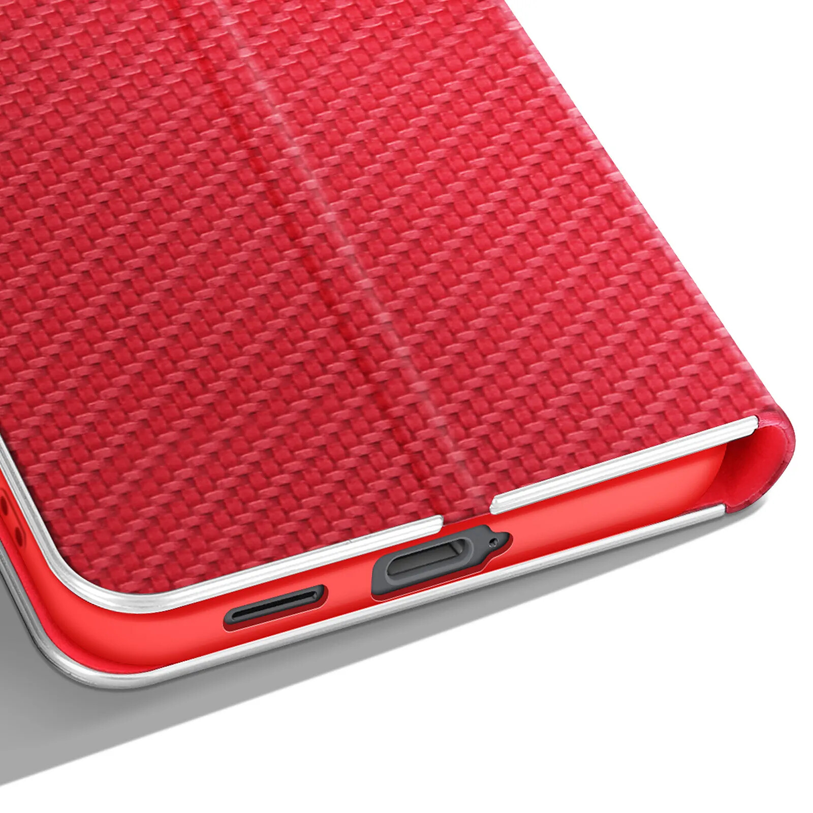 Cet étui folio rouge à effet carbone protège votre Samsung Galaxy S25 FE grâce à un cadre métallisé rigide et une coque interne en silicone souple absorbant les chocs. Le revêtement texturé procure une bonne tenue en main tout en limitant les traces de doigts. L'intérieur en microfibre soft-touch préserve l'écran des rayures. Le rabat aimanté intègre une fente pour carte et peut former un support horizontal stable.
