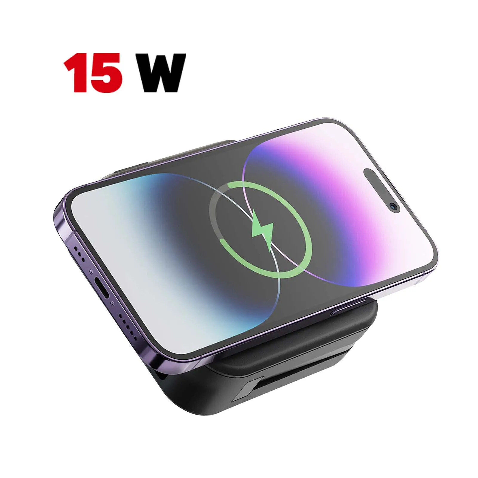 Batterie externe tout-en-un 10000mAh avec charge sans fil MagSafe 15W, port USB-C 20W et USB-A 18W. Inclut câble USB-C intégré et trois prises internationales (A/B, C/E, G). Recharge rapide pour smartphones, tablettes et accessoires Qi. Support béquille intégré pour usage pratique à l'étranger.