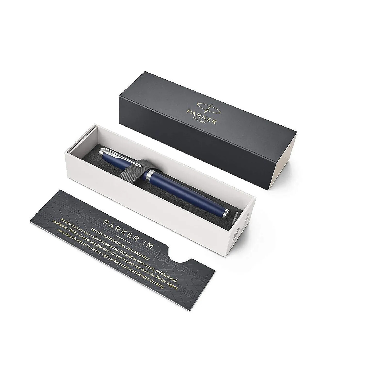 PARKER Plume IM Bleu Royal attributs chromés. Pointe moyenne.