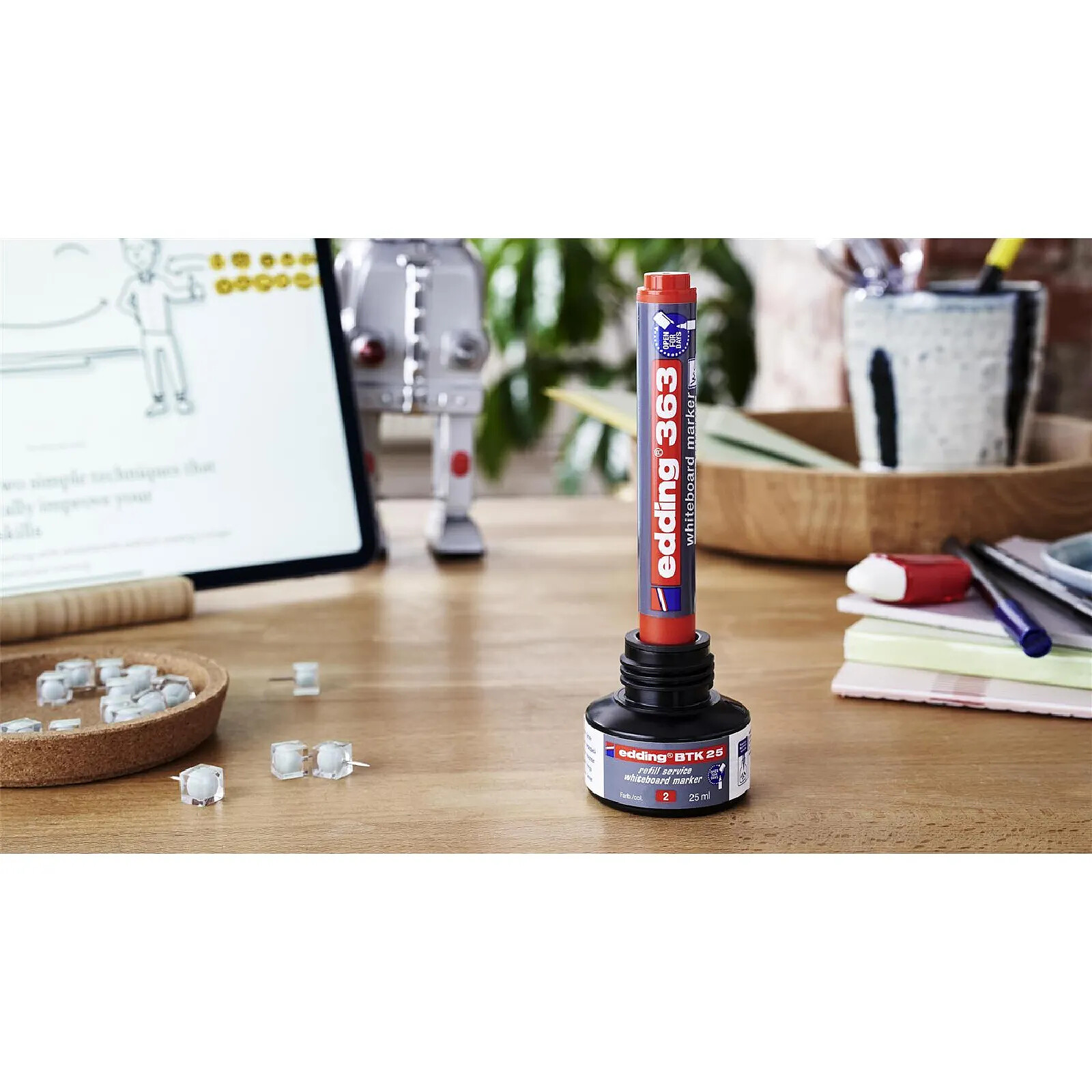 Ce marqueur est rechargeable dans les couleurs noir, rouge, bleu et vert avec la recharge d'encre edding BTK 25