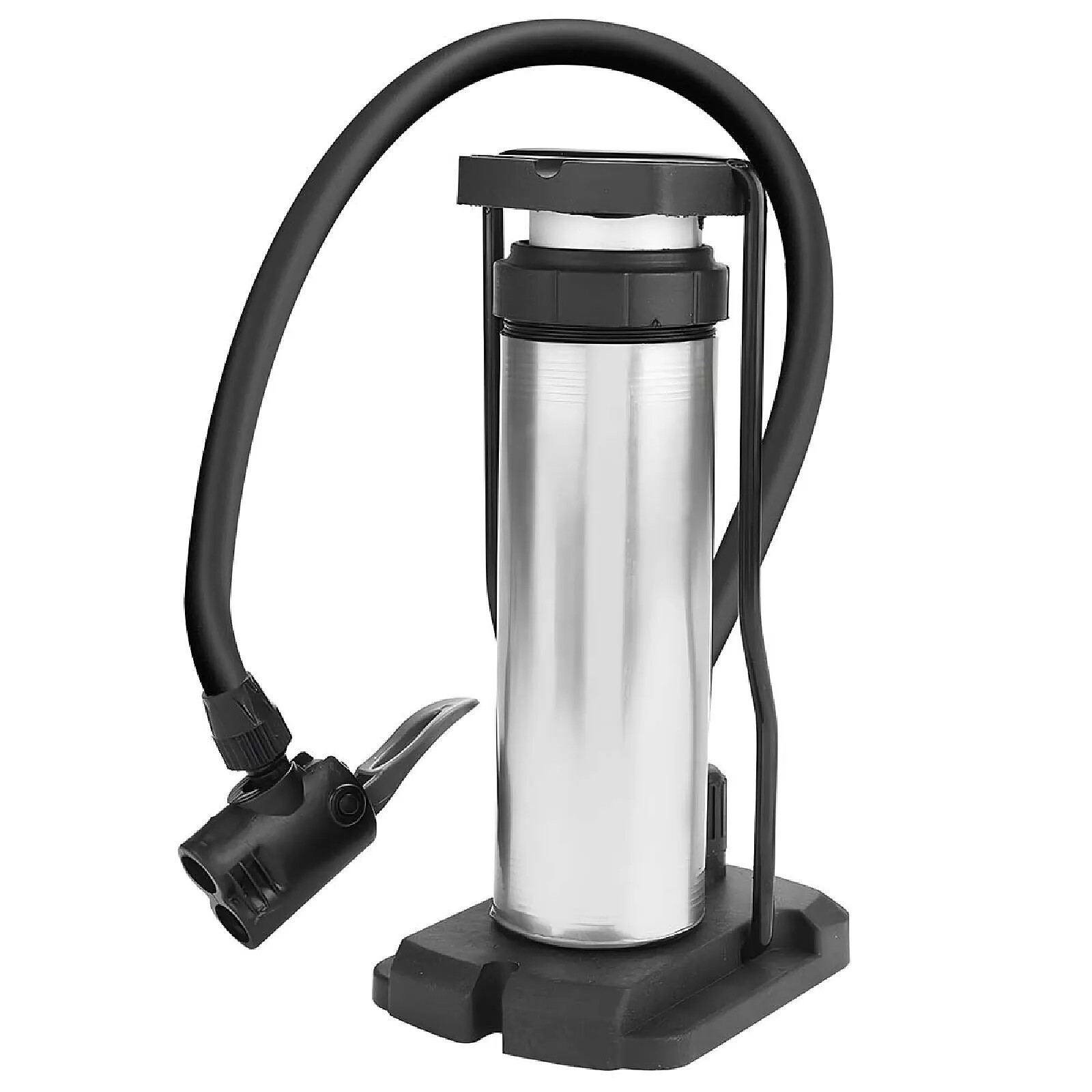 Cette pompe à pied est destinée au gonflage manuel des pneus de vélo, moto, voiture et ballons. Le cylindre vertical en aluminium intègre un piston actionné par pression du pied. Le flexible souple se termine par un embout compatible avec les valves courantes. La base élargie assure la stabilité pendant l'utilisation. Le format compact facilite le transport et le rangement.