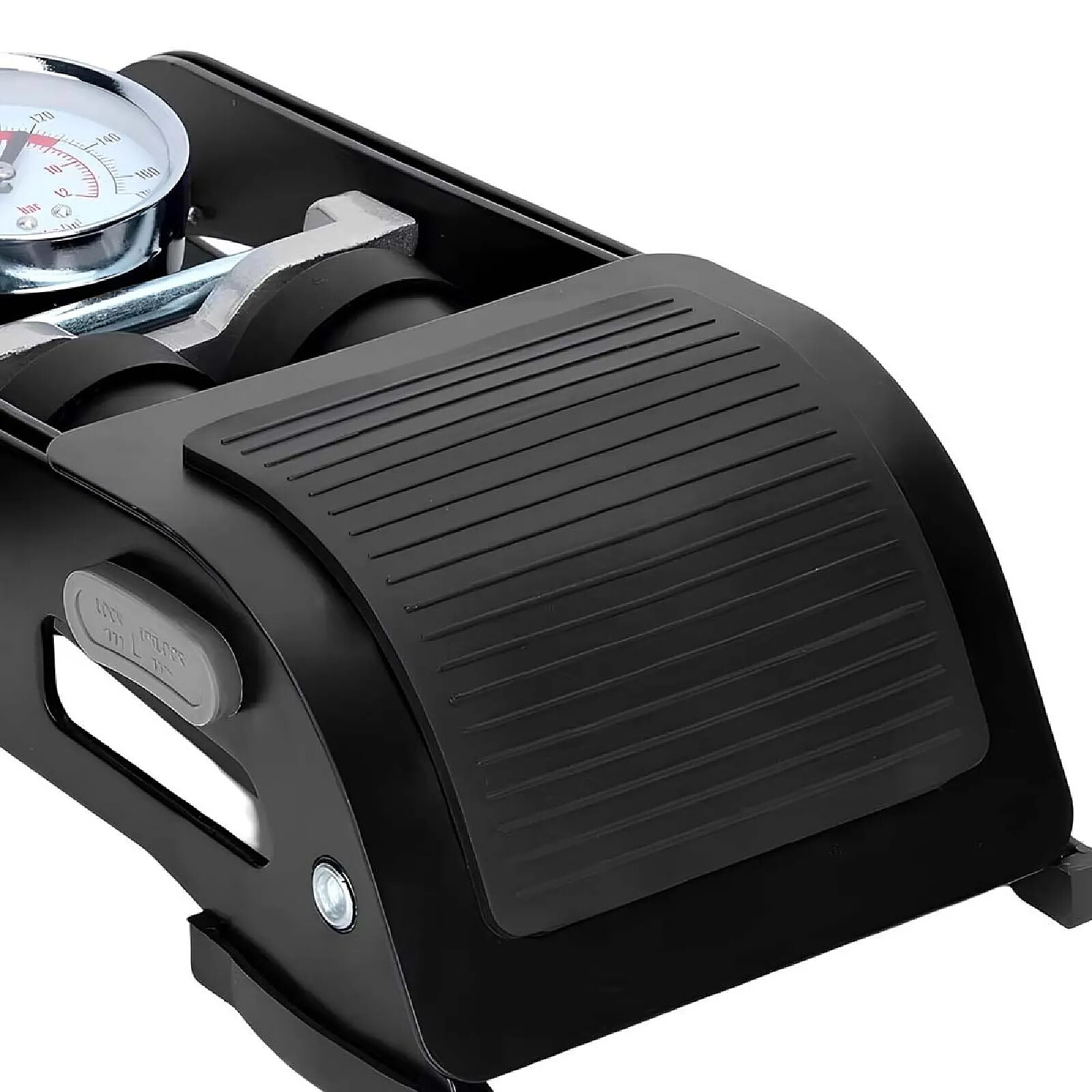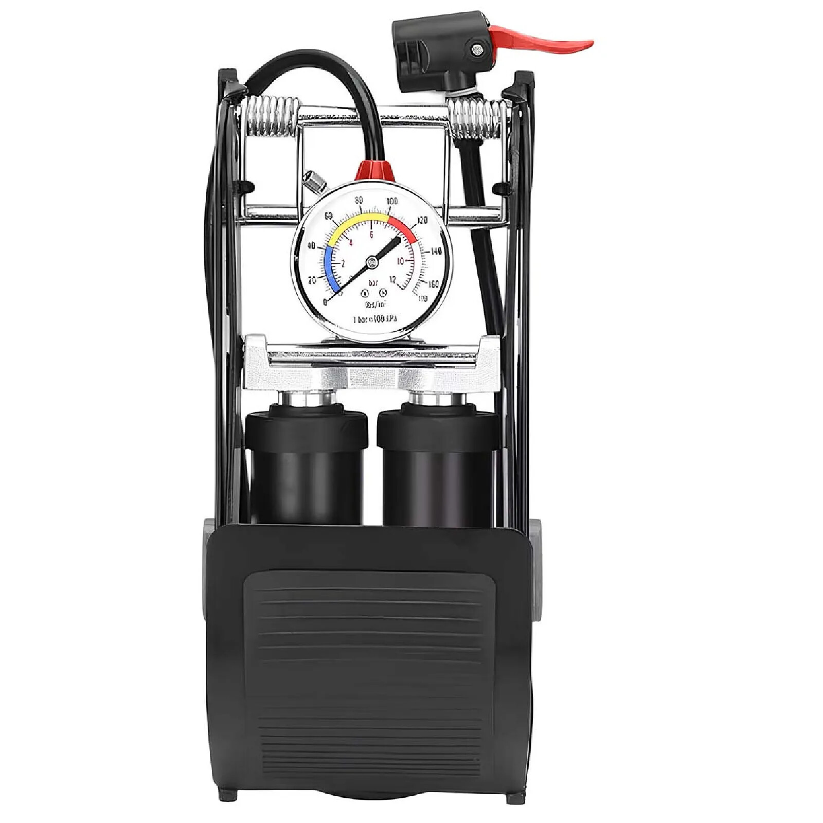 Cette pompe à pied à double cylindre est conçue pour le gonflage manuel de pneus et d'objets gonflables. Le système à double cylindre augmente le volume d'air injecté à chaque pression. La structure associe acier de qualité et plastique technique pour une bonne tenue mécanique. Le manomètre analogique intégré permet la lecture directe de la pression. Le tuyau souple assure la liaison entre la pompe et la valve.