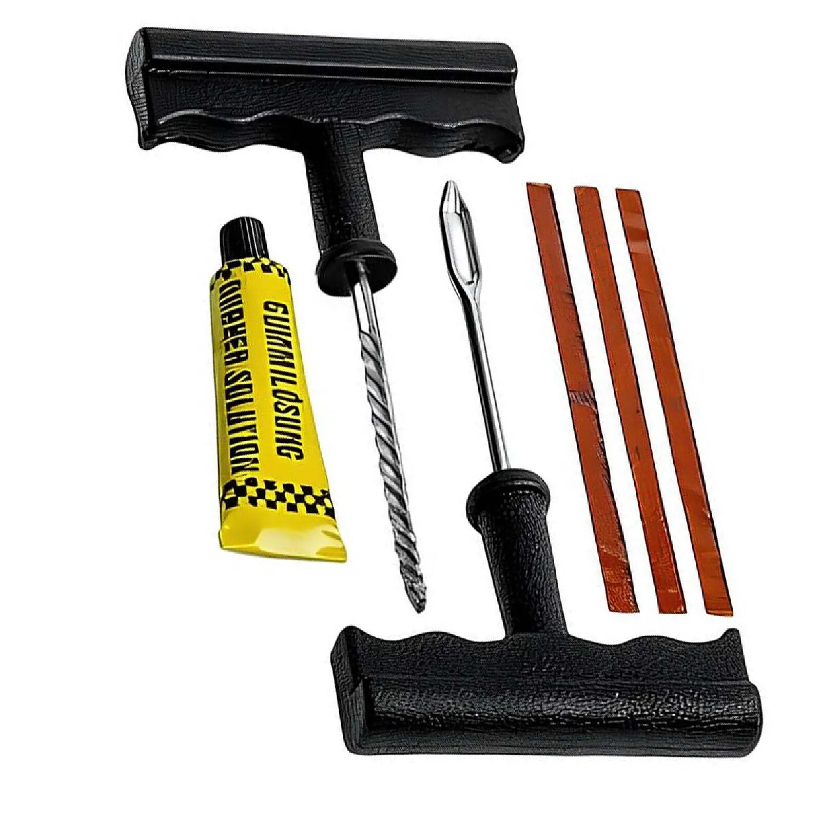 Ce kit de réparation de pneu est destiné au colmatage rapide des perforations sur pneus de voiture, moto ou vélo. Le kit comprend deux outils manuels à poignée en T, l'un pour préparer le trou et l'autre pour insérer les mèches d'étanchéité. Les mèches autocollantes sont conçues pour obturer la perforation sans démontage du pneu. Un tube de colle vulcanisante est fourni pour améliorer l'adhérence lors de l'insertion.