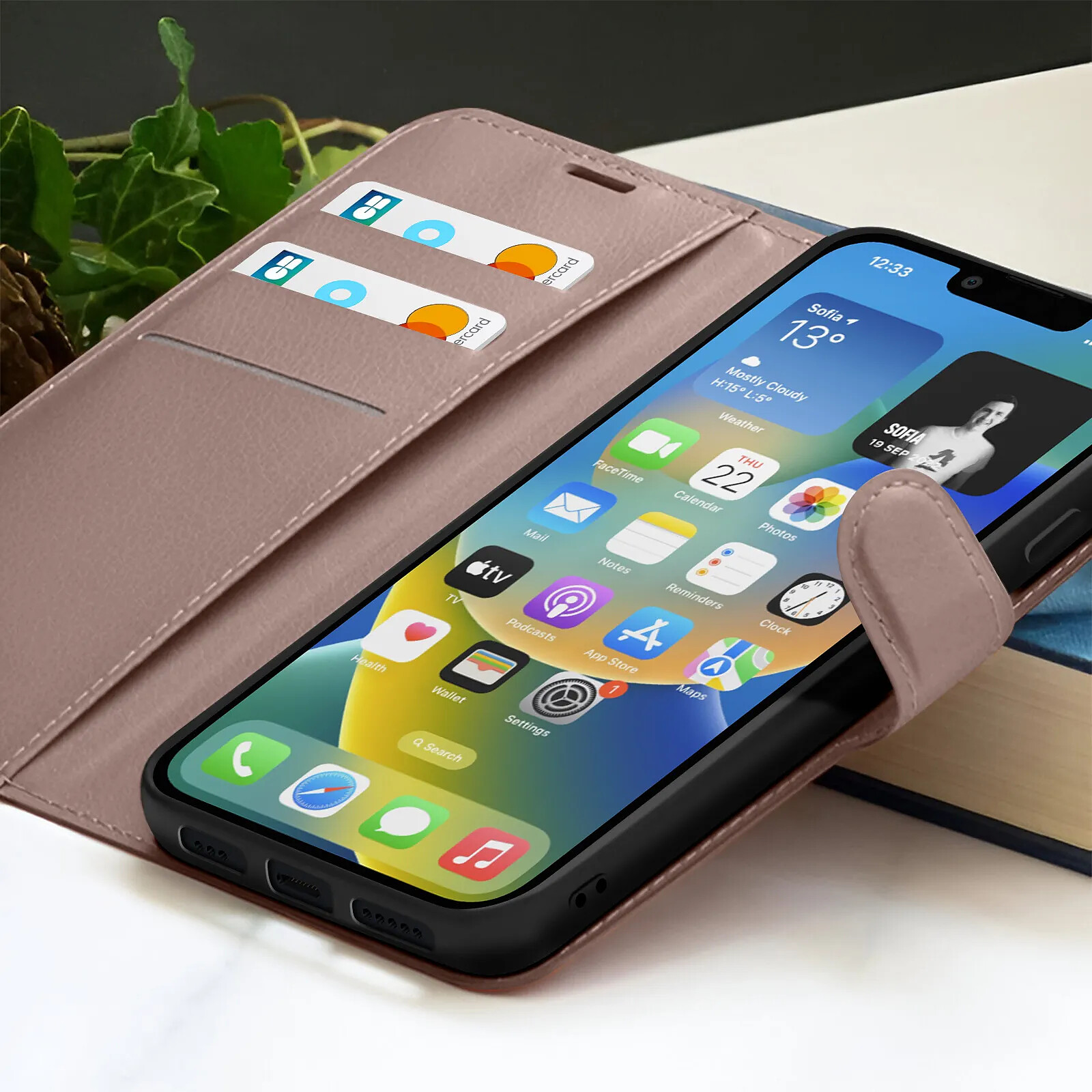 Étui portefeuille compatible iPhone 14 avec fonction support horizontal. Intérieur avec deux emplacements cartes et fermeture magnétique discrète. Protège l'écran et le dos du smartphone tout en offrant un design élégant. Parfait pour une utilisation quotidienne et multimédia.
