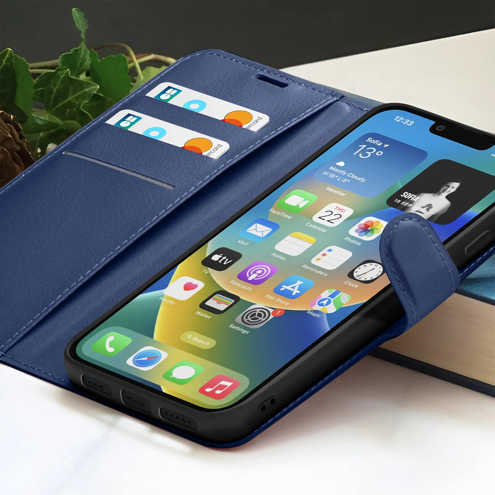Zanaé Étui Portefeuille pour iPhone 14 Support et Languette Magnétique Bleu nuit