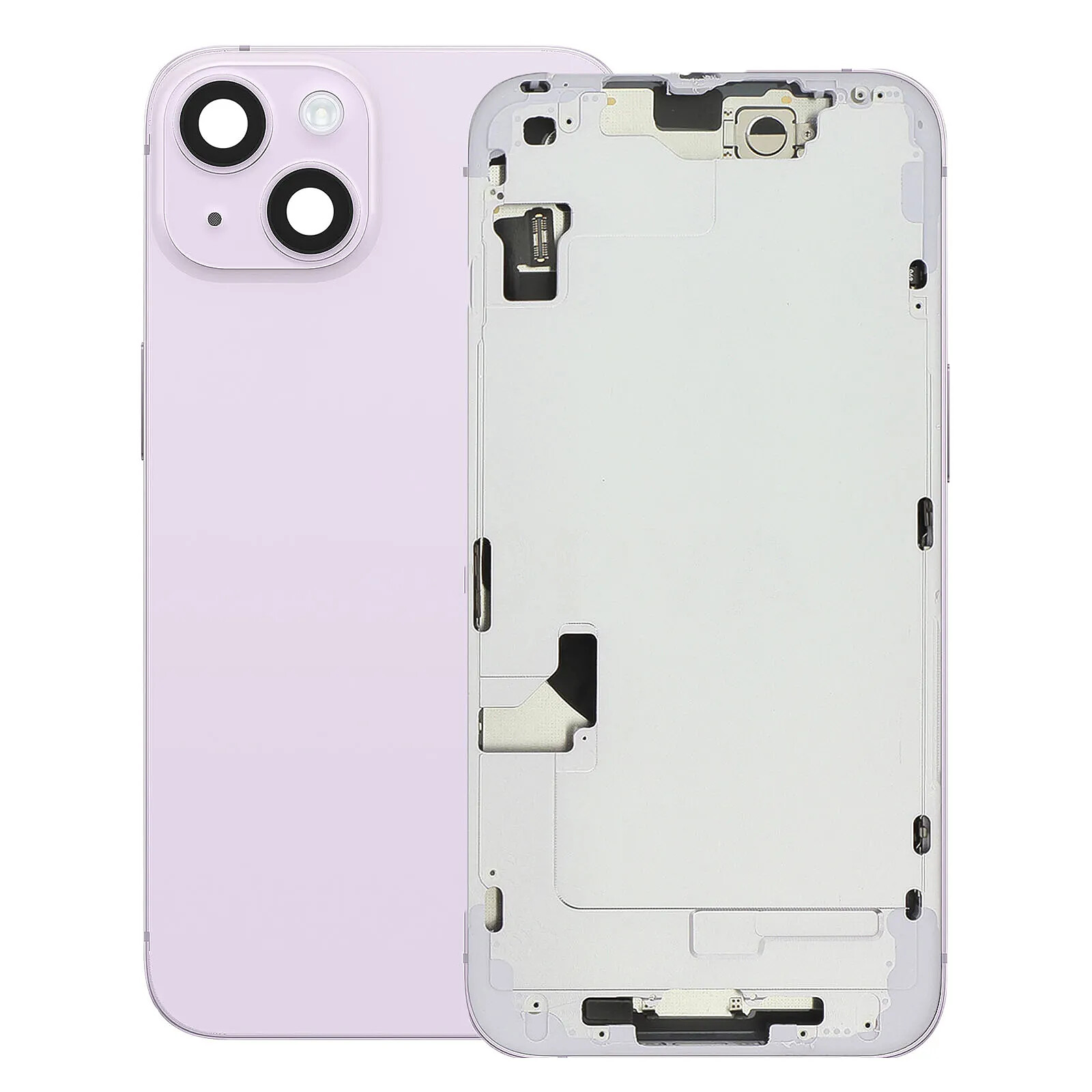 Ce châssis complet violet est conçu pour remplacer un dos cassé ou une structure déformée de l'iPhone 14. La vitre arrière est intégrée à un cadre intermédiaire rigide incluant plaques internes et supports pour composants. Les lentilles caméras ainsi que les boutons volume, power et mute sont déjà préinstallés pour un montage rapide. Prêt à l'emploi, il simplifie la réparation tout en restaurant l'aspect d'origine.
