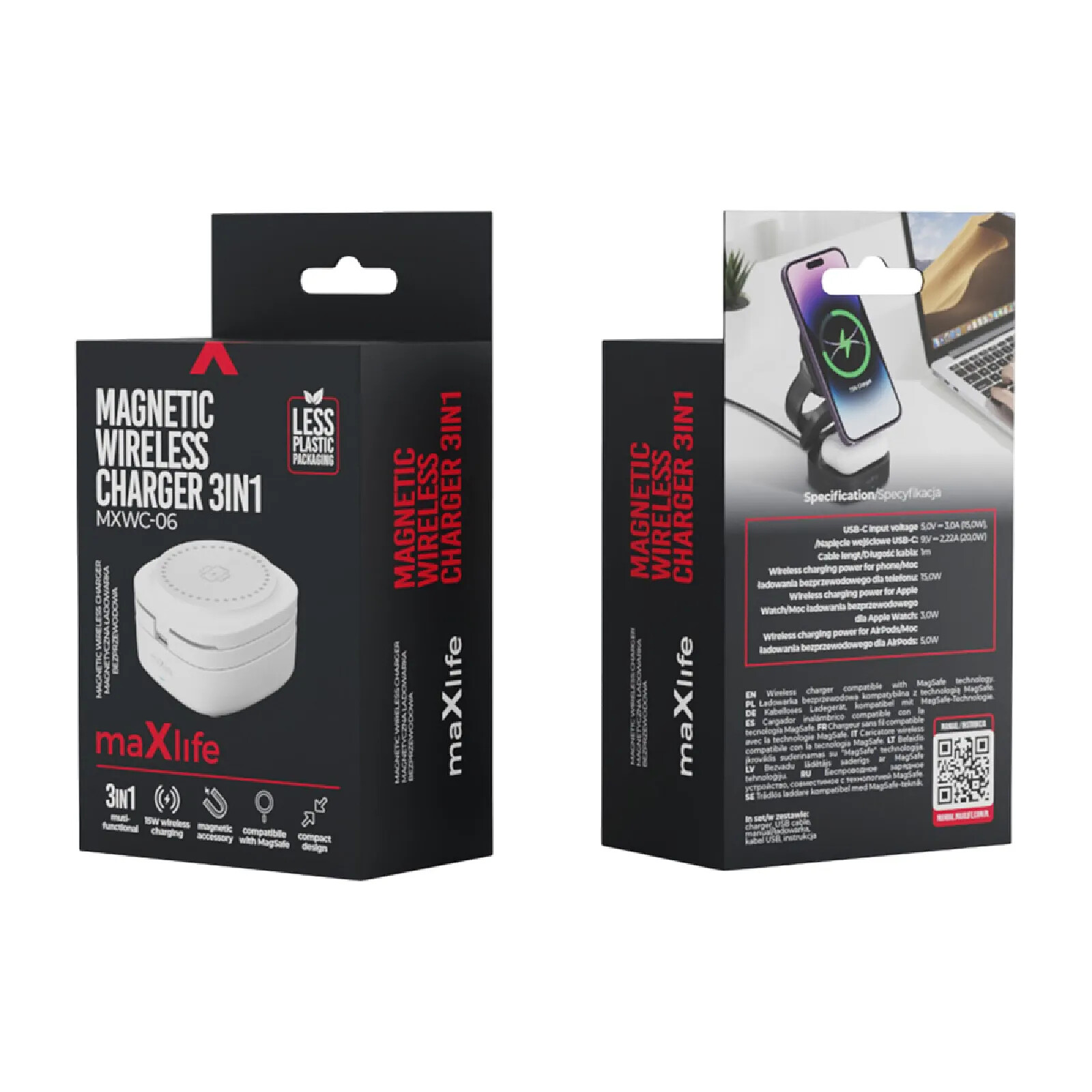 Maxlife Chargeur sans fil 3-en-1 MagSafe Qi 15W pour Smartphone / AirPods / Apple Watch Blanc