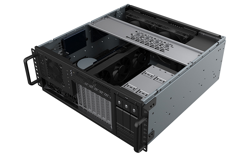 Ce châssis 4U allie ingénierie robuste et modularité avancée : les ports d’extension PCI et les interfaces I/O accessibles à l’avant facilitent l’installation et la maintenance des cartes d’extension, tandis que l’intérieur du boîtier offre des options interchangeables pour l’emplacement de l’alimentation et de la cage de lecteur.
