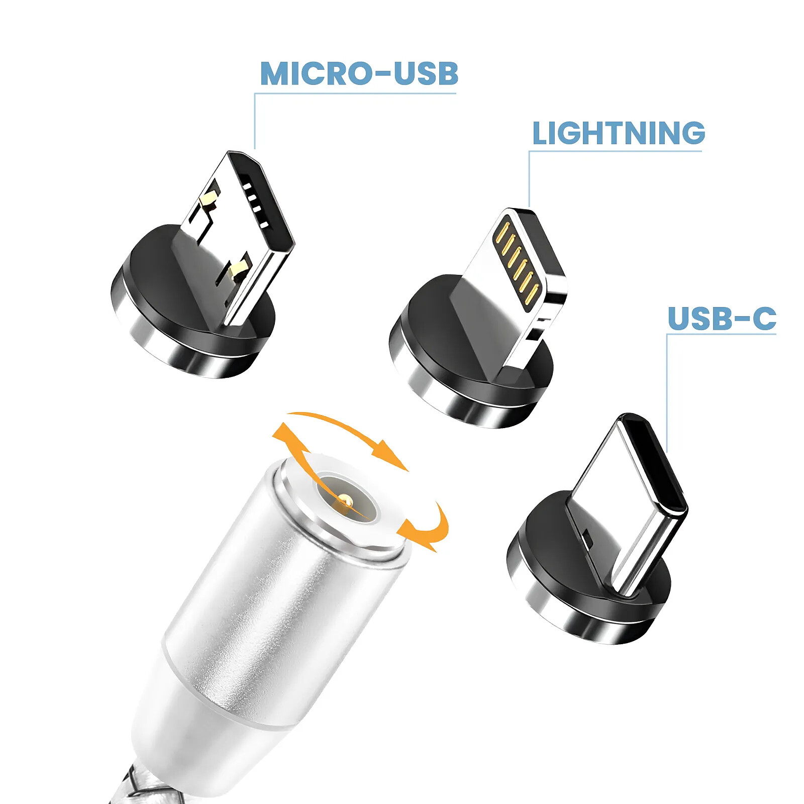 Embouts interchangeables USB-C, Lightning et Micro USB pour charger différents appareils