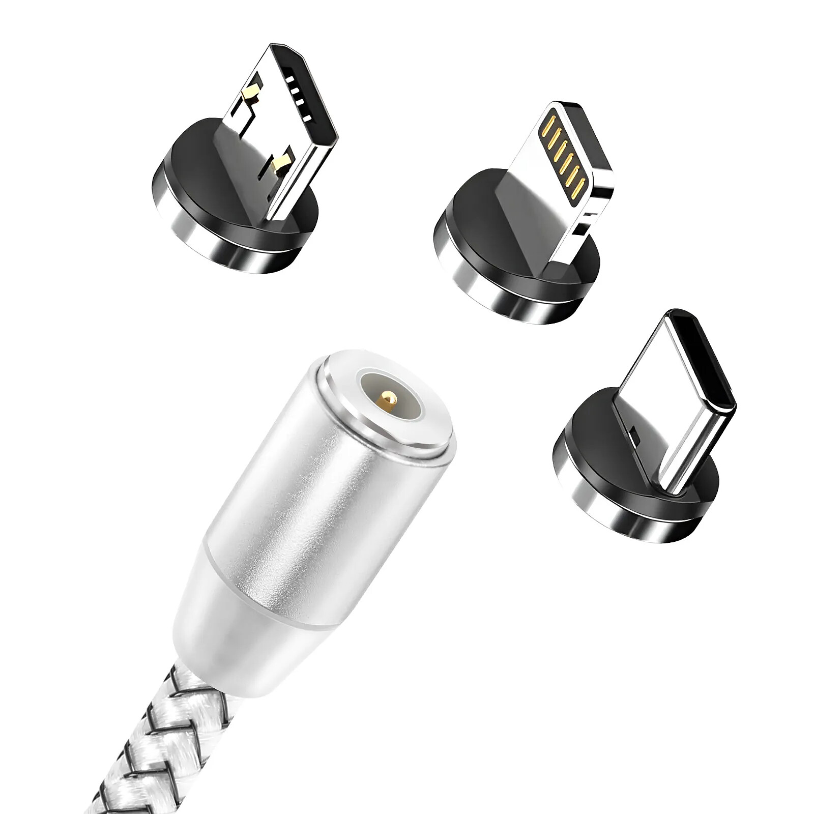 Simplifiez votre recharge avec ce câble magnétique 3 en 1 doté d'une entrée USB-A et d'embouts interchangeables USB-C, Lightning et Micro-USB. La connexion aimantée facilite le branchement au quotidien. Idéal pour alimenter plusieurs appareils avec un seul câble. Sa gaine en nylon tressé argent limite les nuds et l'usure. Longueur 1 mètre adaptée à la maison, au bureau ou en voiture.