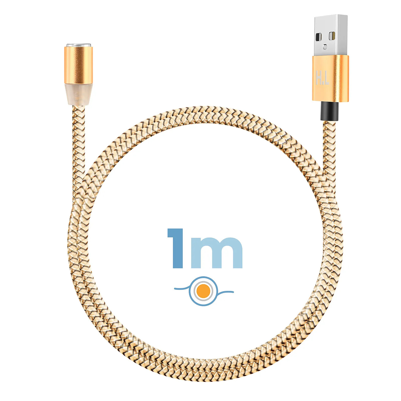 Simplifiez votre recharge avec ce câble magnétique 3 en 1 doté d'une entrée USB-A et d'embouts interchangeables USB-C, Lightning et Micro-USB. La connexion aimantée facilite le branchement au quotidien. Idéal pour alimenter plusieurs appareils avec un seul câble. Sa gaine en nylon tressé dorée limite les nuds et l'usure. Longueur 1 mètre adaptée à la maison, au bureau ou en voiture.