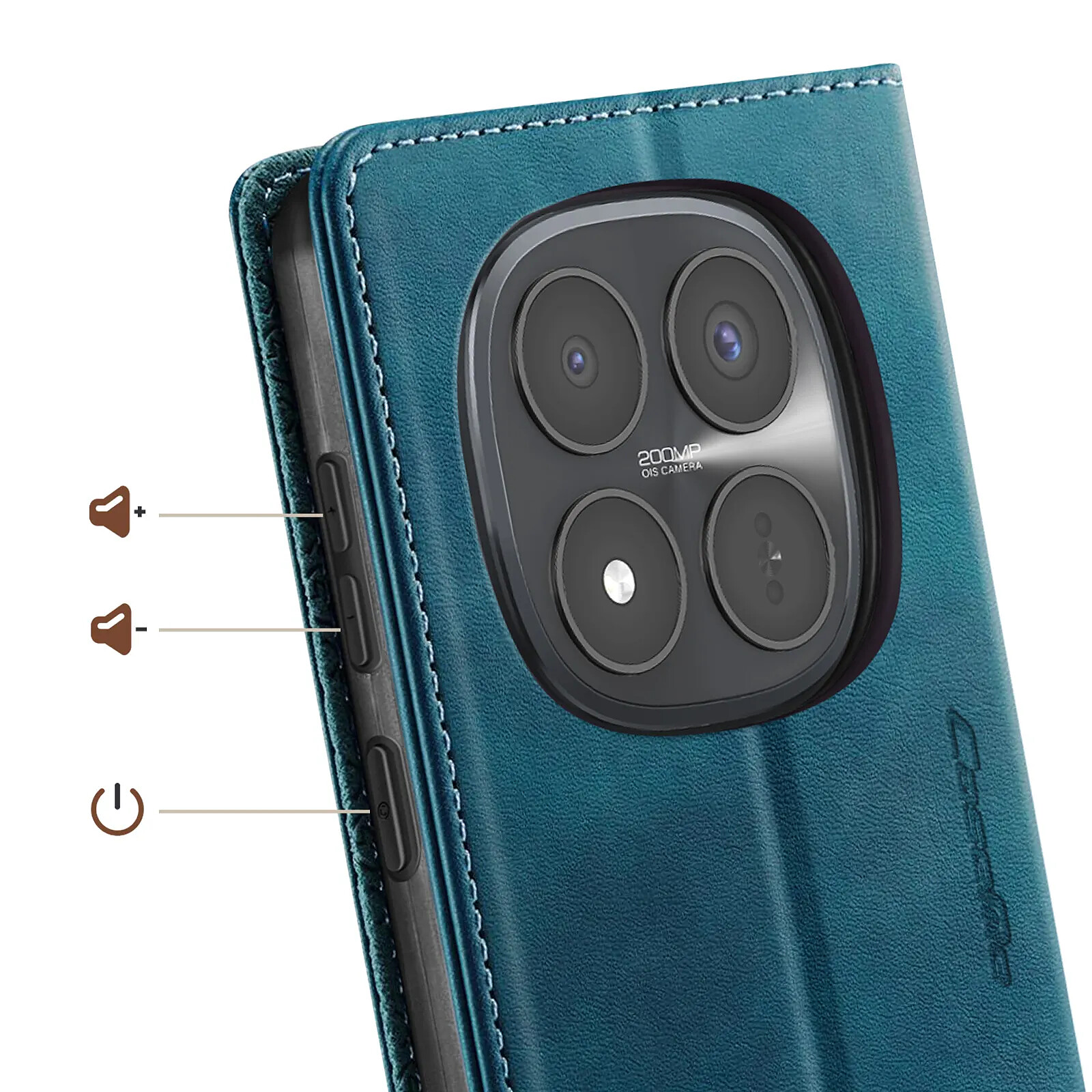 Design vintage élégant en simili cuir avec surpiqûres contrastées et bouton décoratif CaseMe pour un style premium et une prise en main agréable