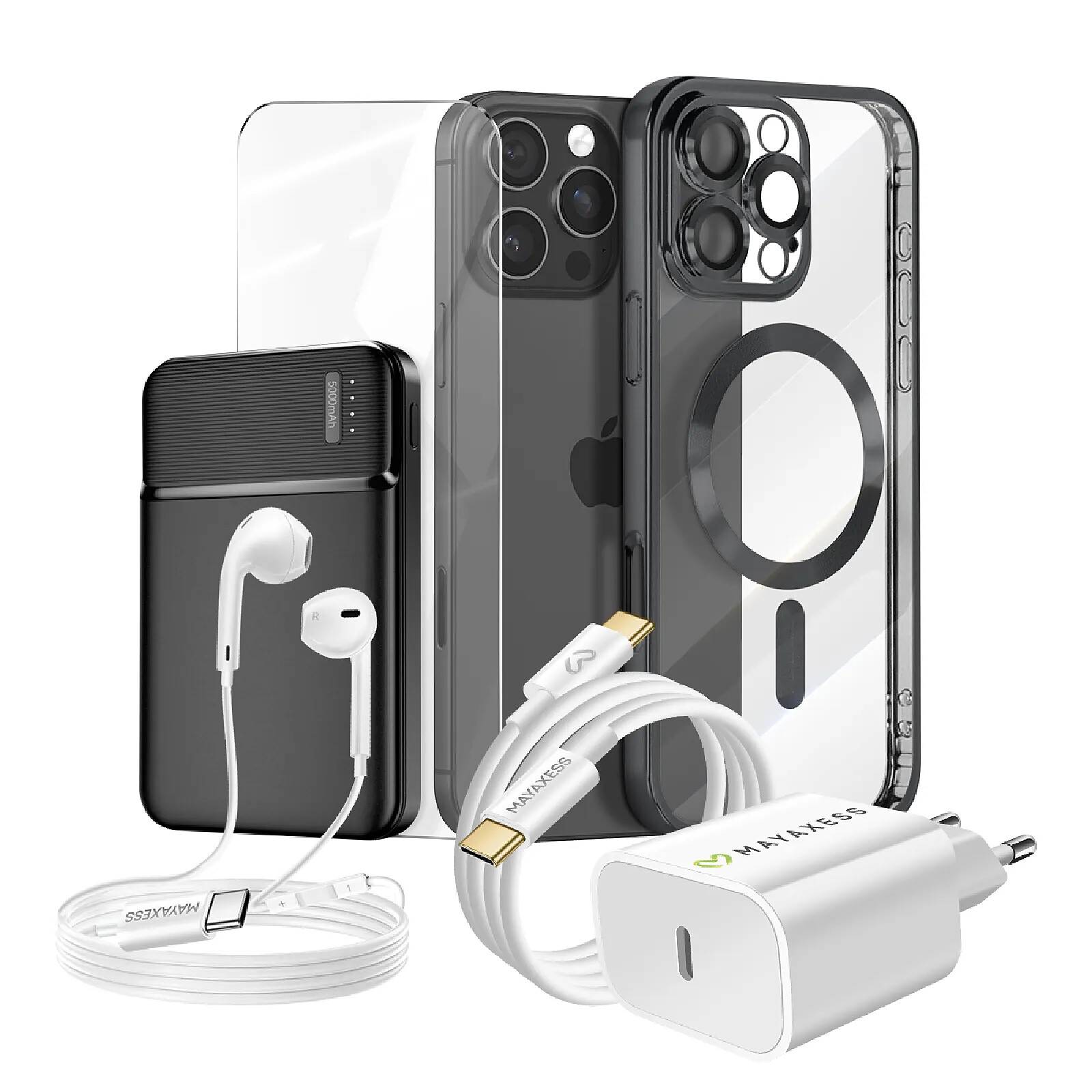 Mayaxess Pack Complet pour iPhone 16 Pro Max Coque, Verre, Chargeur, Batterie externe, écouteurs (6 pièces) Noir |