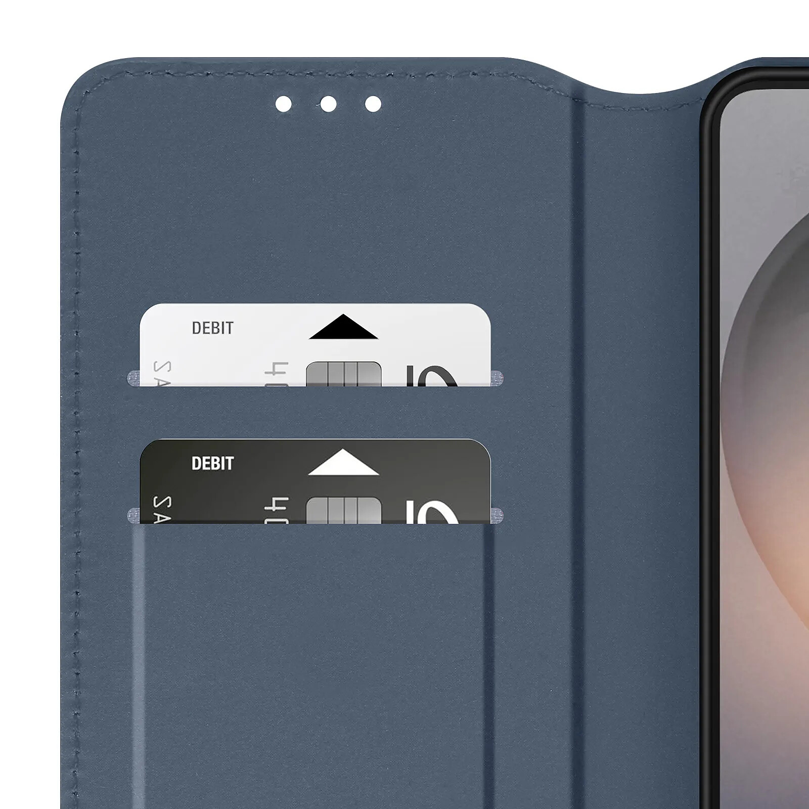 Cet étui bleu nuit Classic Edition pour Galaxy S26 Plus combine un revêtement extérieur en simili cuir et une coque interne souple en silicone à absorption d'impact. Le rabat avant intègre deux rangements pour cartes et se replie en support horizontal pour le visionnage de vidéos. La fermeture magnétique maintient l'étui fermé tandis que les découpes précises assurent l'accès au port et aux boutons latéraux.