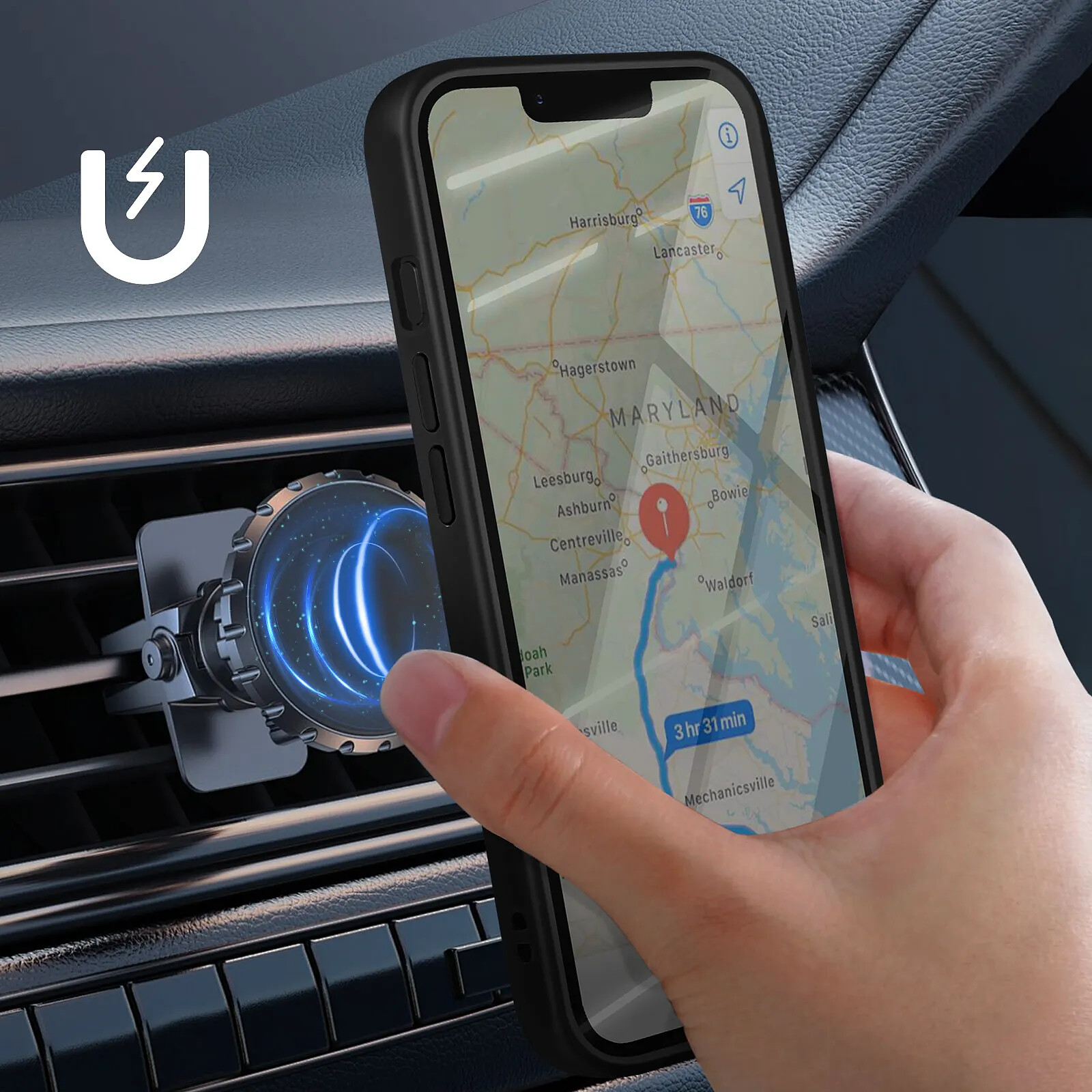Intègre une plaque magnétique compatible avec les supports voiture sans ajout d'accessoires
