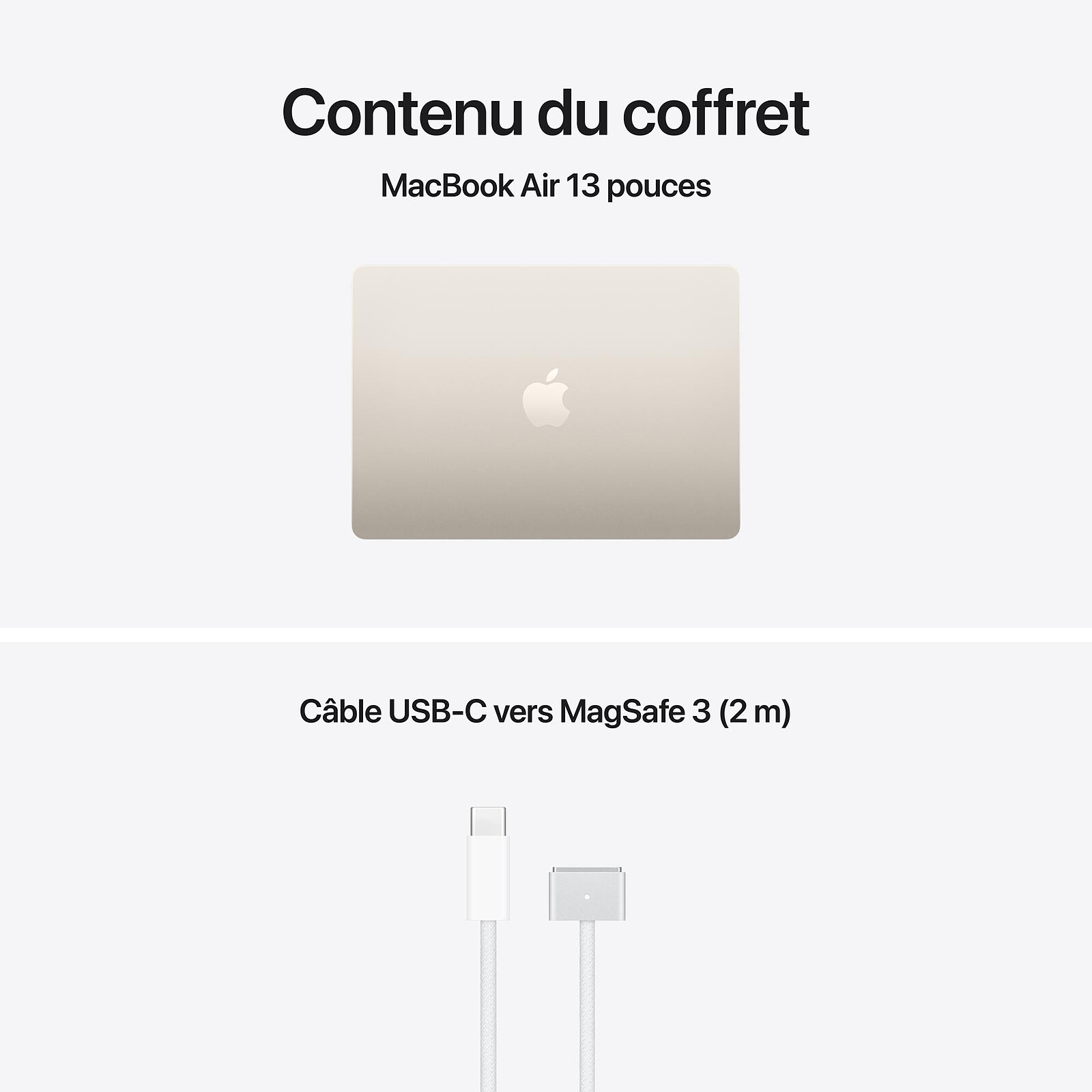 - ADAPTATEURS SECTEUR – Veuillez noter que le MacBook Air (13 pouces) est livré avec un câble de charge USB C vers MagSafe 3, mais sans adaptateur secteur. Un adaptateur secteur USB C ou une autre source d’alimentation USB PD capable de fournir 30 W (ou plus) est nécessaire pour recharger cet appareil. Pour une recharge optimale, Apple recommande d’associer ce Mac à l’Adaptateur secteur USB C 30 W ou à l’Adaptateur secteur USB C 70 W pour profiter de la charge rapide (jusqu’à 50 % de charge en 30 minutes)6.