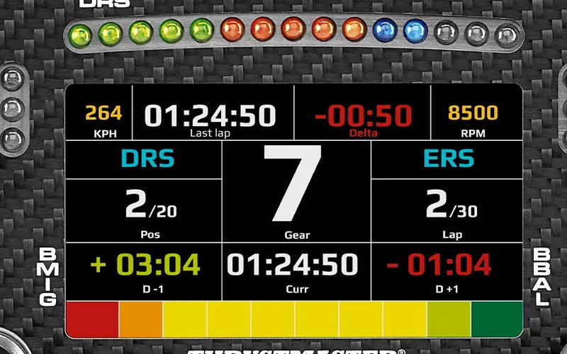 L’écran LCD IPS de 4,3 pouces affiche jusqu’à 69 informations, et les 21 LEDs informent en temps réel sur le régime moteur et les drapeaux de course.