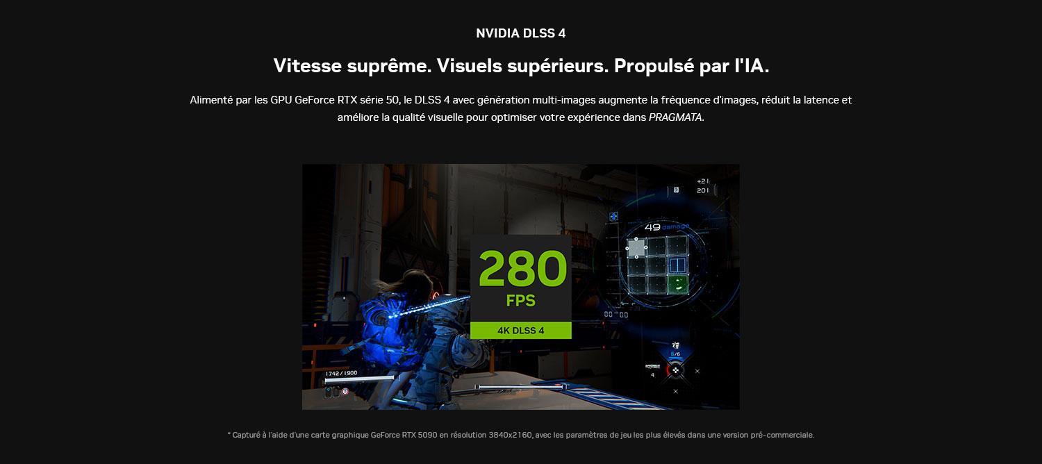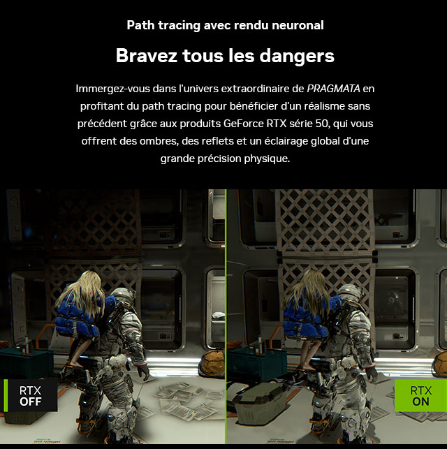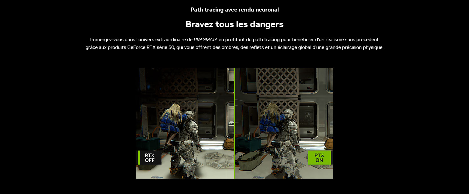 Pendant une durée limitée, obtenez PRAGMATA pour l'achat d'un PC de bureau ou d'une carte graphique éligible NVIDIA GeForce RTX™ 5090, 5080, 5070 Ti, 5070 ou d'un PC portable équipé d'un GPU GeForce RTX™ 5090, RTX 5080, RTX 5070 Ti ou RTX 5070.