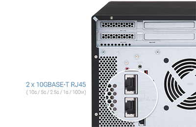 Deux ports 10GBASE-T 10GbE intégrésLe TS-1677X offre non seulement quatre ports Ethernet Gigabit mais également deux ports 10GBASE-T RJ45 pour prendre entièrement en charge les réseaux haut débit 10GbE et accélérer les applications telles que la virtualisation et l'édition vidéo à la volée. Les ports 10GBASE-T RJ45 prennent aussi en charge les vitesses 10G/5G/2,5G/1G/100M afin de répondre à différentes demandes de bande passante. |
