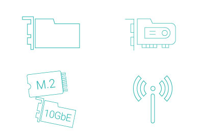 Extension de la fonctionnalité du NAS avec les emplacements PCIeLe TS-1677X comprend trois emplacements PCIe (1 x PCIe 3.0 x8, 1 x PCIe 3.0 x4, 1 x PCIe 2.0 x4) qui permettent d'installer différentes cartes d'extension pour accroître le potentiel des applications. Vous pourrez ainsi ajouter un adaptateur 10GbE / 40GbE pour un débit fulgurant, une carte QM2 SSD M.2 / 10GbE pour des performances optimisées, une carte graphique afin d'accélérer le traitement vidéo ou encore une carte réseau sans fil. |