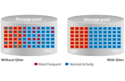 Le cache SSD et la hiérarchisation automatique permettent l'optimisation de l'efficacité de stockage 24h/24, 7j/7Le TS-1677X fournit quatre baies de lecteur 2,5 pouces pour le cache SSD, parfaites pour améliorer le flux de travail général des applications exigeantes en IOPS aléatoires telles que la virtualisation. La technologie Qtier renforce le TS-1677X avec la hiérarchisation automatique qui hiérarchise constamment les fichiers et les données en fonction de leur fréquence d'accès. Le nouveau Qtier 2.0 comprend également la reconnaissance E/S qui permet de hiérarchiser le stockage SSD avec un espace réservé comme un cache pour gérer les E/S par rafale en temps réel, ce qui maximise grandement les avantages des SSD. |