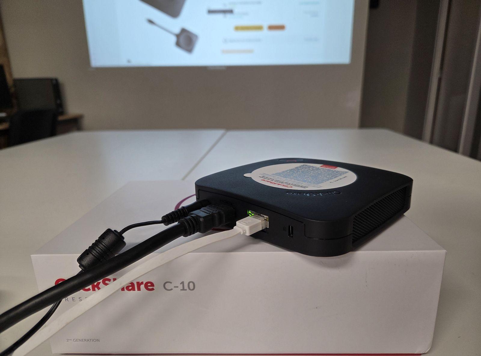 Le dispositif répond parfaitement à la description. Le paramétrage est facile et sécurisée. L’interface de configuration est accessible au choix via WI-FI ou par réseau filaire. De nombreux guides sont disponibles en français sur le site de Barco. Toutefois l’assistant d'installation se suffit à lui-même pour une mise en place type. Ici, la diffusion audiovisuelle est assurée par le vidéoprojecteur ViewSonic PX700HDHE directement branché en HDMI à la base ClickShare.
