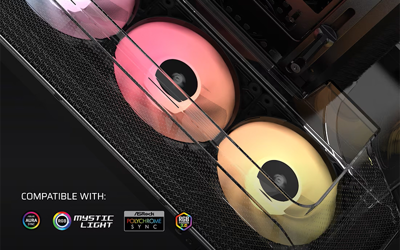 Les ventilateurs RS-R ARGB 120 mm à rotor inversé préinstallés dans la partie inférieure du châssis permettent un refroidissement puissant et silencieux avec un éclairage RGB magnifique et sans obstruction. Les ventilateurs peuvent être connectés en guirlande et branchés sur les connecteurs PWM et +5V RGB d'une carte mère pour un éclairage facile et un contrôle de la vitesse du ventilateur.
