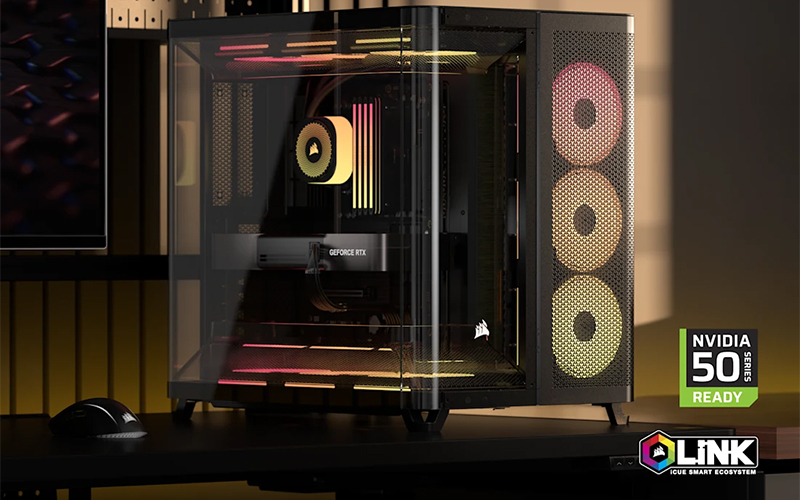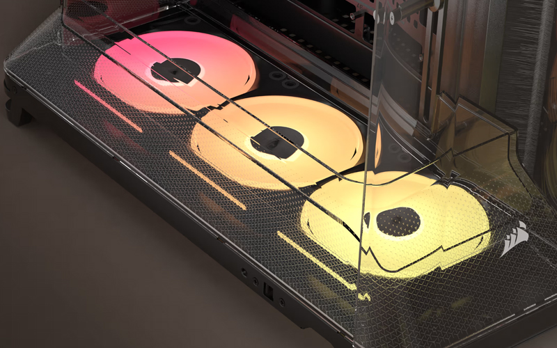 Les ventilateurs iCUE LINK LX-R RGB 120 mm à rotor inversé préinstallés dans la partie inférieure du châssis permettent un refroidissement efficace et silencieux avec un éclairage RGB magnifique et sans obstruction.