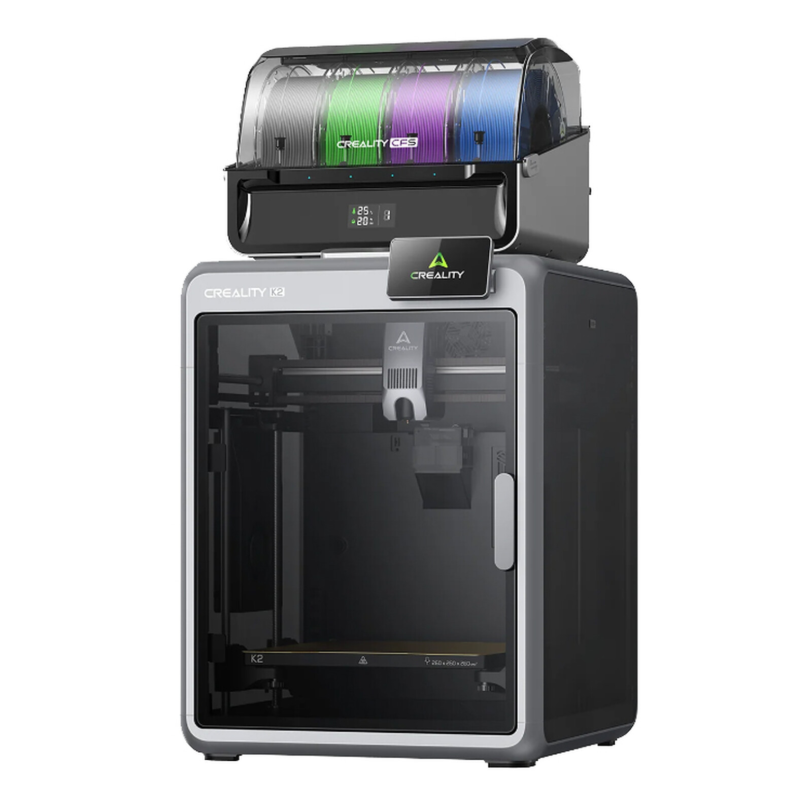 La K2 Combo est donc très pratique grâce à son système intelligent de gestion des filaments, le CFS (Color Filament System) avec ses 4 emplacements pour bobines, vous pouvez imprimer en multicolore et utiliser différents matériaux en même temps. En ajoutant 3 autres CFS (non inclus), vous pouvez atteindre jusqu'à 16 couleurs, avec plein de combinaisons possibles. Le système s'occupe tout seul du chargement et du retrait des filaments, ainsi fini le temps perdu à le faire manuellement. Enfin, le CFS est étanche, avec des indicateurs de température et d'humidité, lui permettant d'aussi servir de boîte de séchage pour conserver vos filaments dans les meilleures conditions.