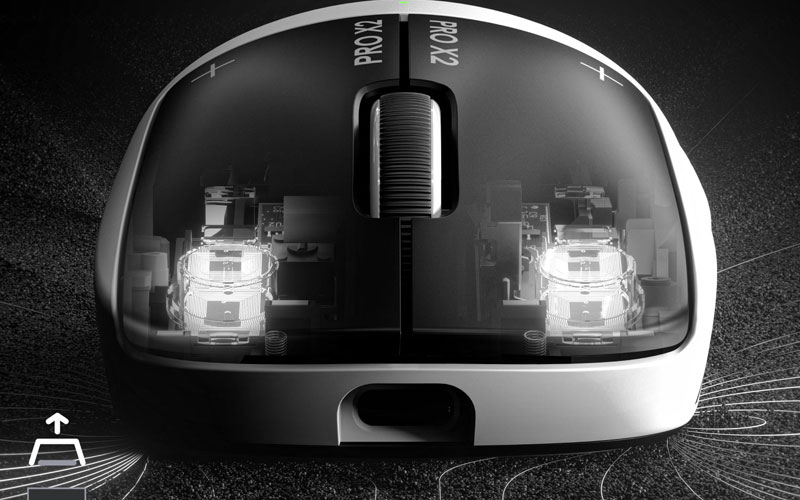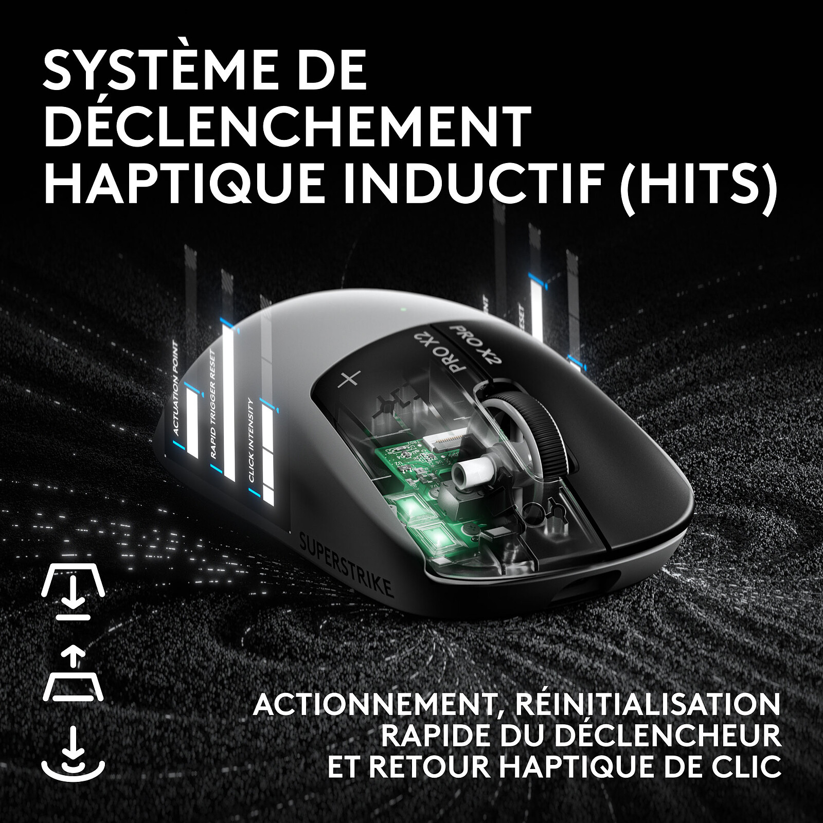 La Logitech G Pro X2 Superstrike intègre le système HITS, conçu pour accélérer la vitesse de clic et permettre un réglage fin des deux boutons principaux, avec des points d’actionnement et de réinitialisation personnalisables. La connexion sans fil LIGHTSPEED prend en charge un taux d’interrogation allant jusqu’à 8000 Hz, tandis qu’un mode filaire est possible (jusqu’à 1000 Hz).
