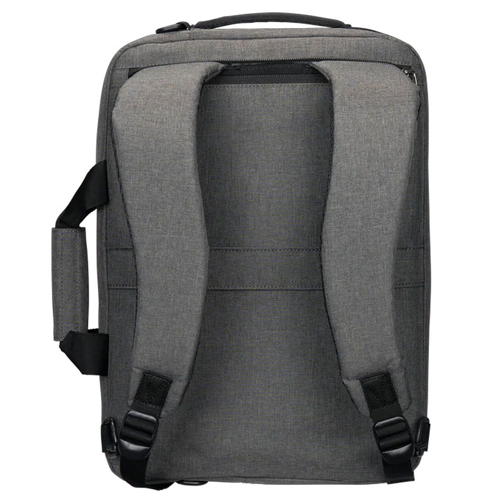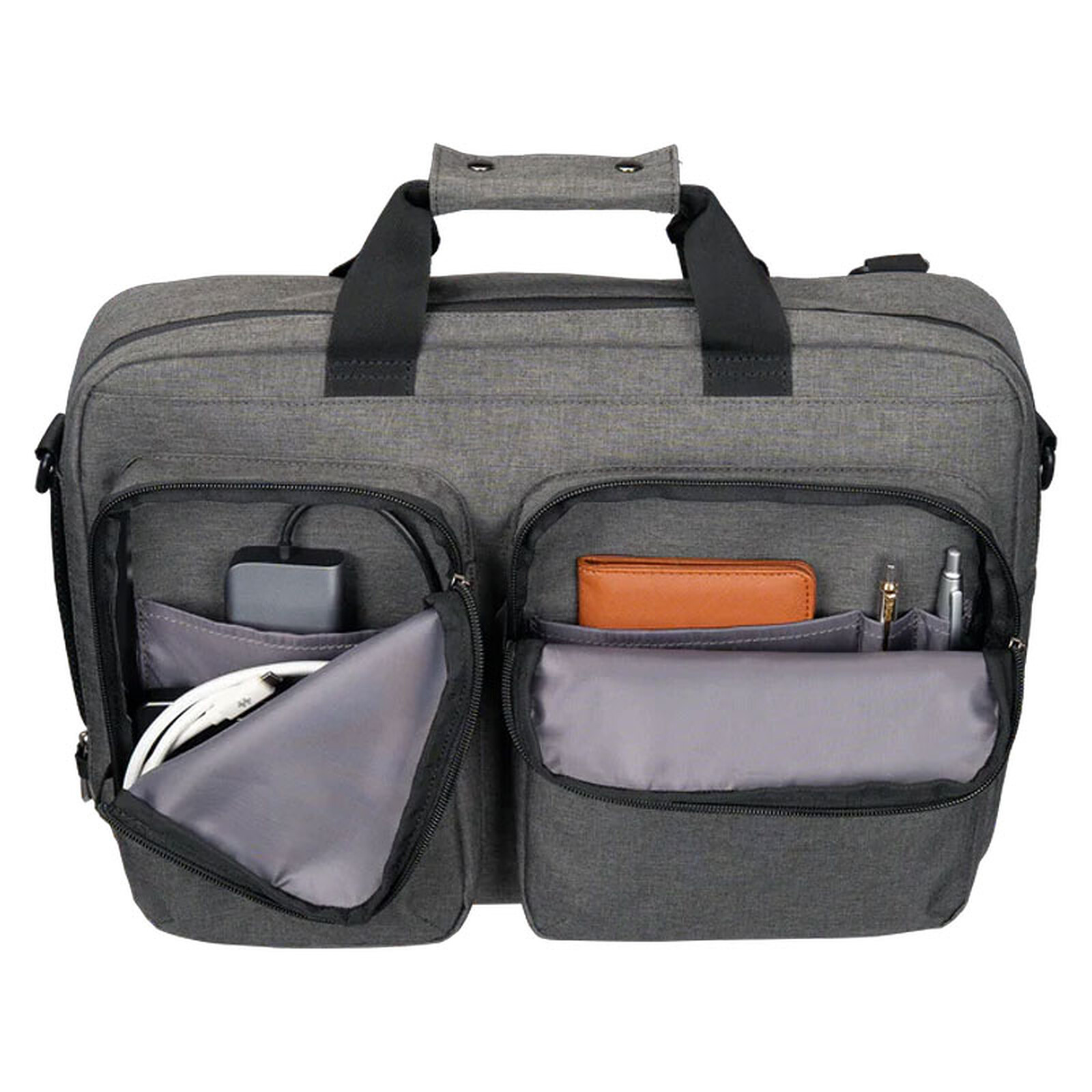 La conception repose sur un design hybride convertible permettant une utilisation en mallette ou en sac à dos, grâce à des bretelles escamotables. Le sac intègre un compartiment rembourré pour ordinateur portable et tablette, ainsi qu’un organisateur interne destiné aux petits accessoires. Une fermeture éclair antivol contribue à la sécurisation du contenu. Le portage est complété par une bandoulière réglable et amovible et une sangle passante pour trolley, facilitant l’utilisation avec une valise.