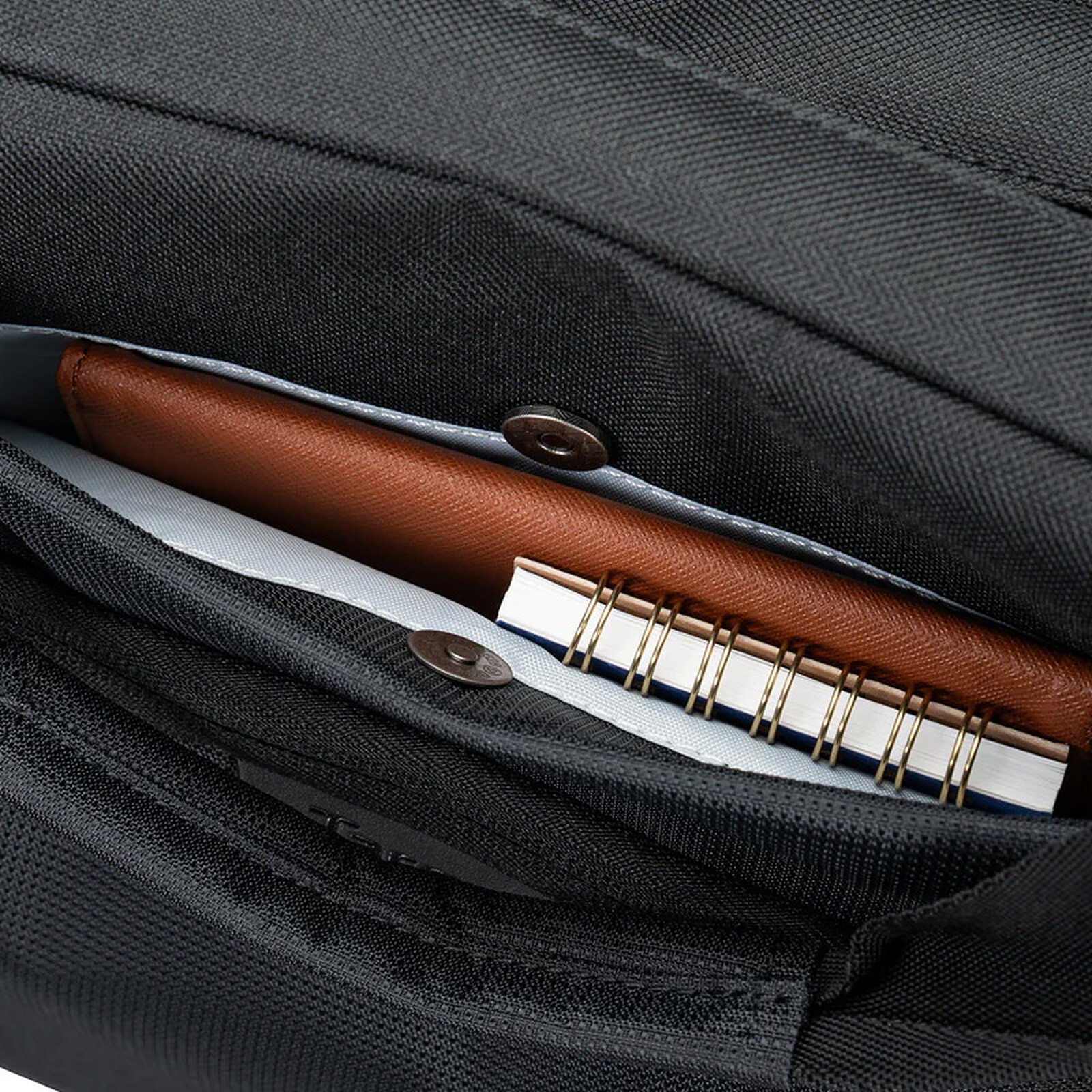 Au quotidien, elle facilite la gestion des déplacements grâce à sa sangle pour chariot, permettant de fixer le porte-documents à des bagages à roulettes. Les fermetures éclair antivol ajoutent une couche de sécurité lors des trajets, et la poche dissimulée aide à garder certains effets à portée de main sans les exposer. L’intérieur est fabriqué à partir de matériaux recyclés, dont l’équivalent de 3 bouteilles d’eau, avec une doublure en PET recyclé et l’utilisation de matériaux recyclés certifiés GRS (Global Recycled Standard).