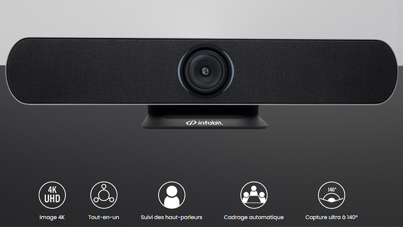 Pensée pour les salles de réunion de petite à moyenne taille, la barre de visioconférence Infobit iCam VB50 se distingue par son design tout-en-un intégrant caméra 4K, microphones et haut-parleur pour une expérience fluide et immersive. Grâce à sa résolution Ultra HD et son zoom numérique 5x, elle capture chaque détail avec précision, tandis que son champ de vision ultra large de 120° permet d’inclure tous les participants sans effort. Dotée des technologies avancées d’auto-cadrage et de suivi des intervenants, elle ajuste automatiquement l’image pour mettre en valeur les personnes qui parlent, garantissant une communication naturelle et dynamique. Côté audio, ses microphones à formation de faisceau couvrent jusqu’à 6 mètres et, associés à un haut-parleur Hi-Fi, offrent un son clair et puissant, renforcé par les algorithmes 3A (AEC, AGC, ANS) pour une qualité full duplex optimale. Facile à installer en plug & play via USB, compatible avec les principales plateformes collaboratives et équipée du Bluetooth 5.0, la VB50 s’impose comme une solution complète, performante et intuitive pour des visioconférences professionnelles sans compromis.