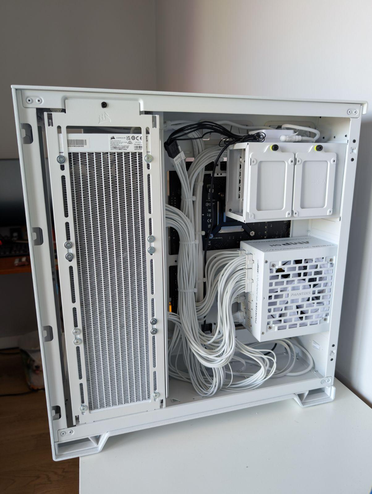 Questo alloggiamento per acquario Corsair con sistema Link integrato semplifica davvero la vita quando si tratta di gestire gli RGB. Ci sono molti meno cavi, il che conferisce un aspetto pulito e ben realizzato. Ho dovuto sforzarmi un po' di più per gestire lo spazio occupato dal pannello posteriore, ma è più che altro un'abitudine a cui sono abituato con i case di medie dimensioni. Detto questo, non mi pento di aver scelto il 2500X rispetto al 3500X. Anche se impone alcuni vincoli in termini di componenti, è un case che si può facilmente collocare su una scrivania, anche una "standard" di 60 x 120 cm, senza che diventi troppo imponente e invadente. Mi piace anche il fatto che si possano collocare gli SSD sul retro del pannello frontale, piuttosto che nel vano posteriore, è una soluzione ben fatta e ben pensata (come spesso accade con Corsair). Non ho avuto grossi problemi nell'assemblaggio.