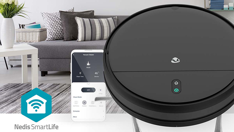 Puoi definire un programma di pulizia giornaliero o settimanale, oppure inviarlo direttamente a una zona specifica della tua casa. Questo robot aspirapolvere è dotato anche di un telecomando, in modo che tu possa controllarlo direttamente. Collegandolo ad altri prodotti connessi tramite l'app Nedis SmartLife, puoi anche programmare delle automazioni, ad esempio per far sì che l'aspirapolvere si avvii automaticamente quando sei fuori casa o quando spegni le luci prima di andare a letto.