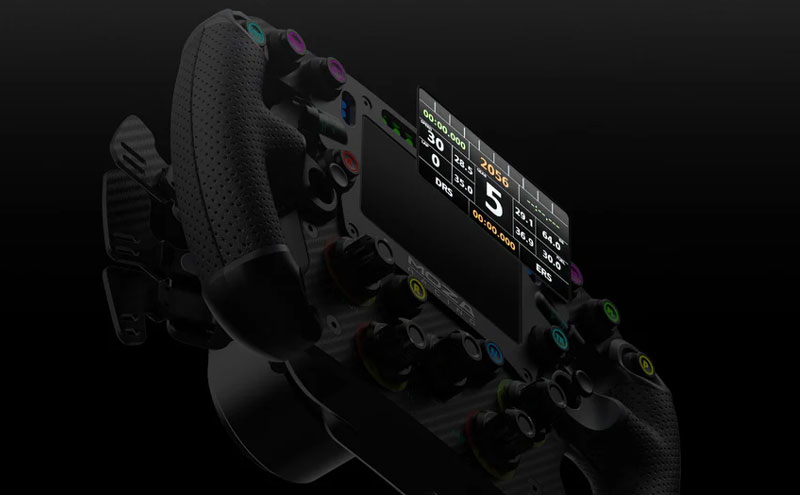 Il volante è dotato di 6 paddle (inclusi DRS e KERS), 2 interruttori a 7 vie, 3 encoder a pollice e 5 encoder rotativi per regolare istantaneamente gli aiuti, la mappatura del motore e la frenata. I 6 LED RGB montati lateralmente e i 10 indicatori di velocità (LED superiori) forniscono indicazioni visive essenziali quando sei in movimento. La costruzione in alluminio aerospaziale CNC, carbonio 3K da 5 mm e pelle microfibra perforata garantisce robustezza e una sensazione di qualità superiore.
