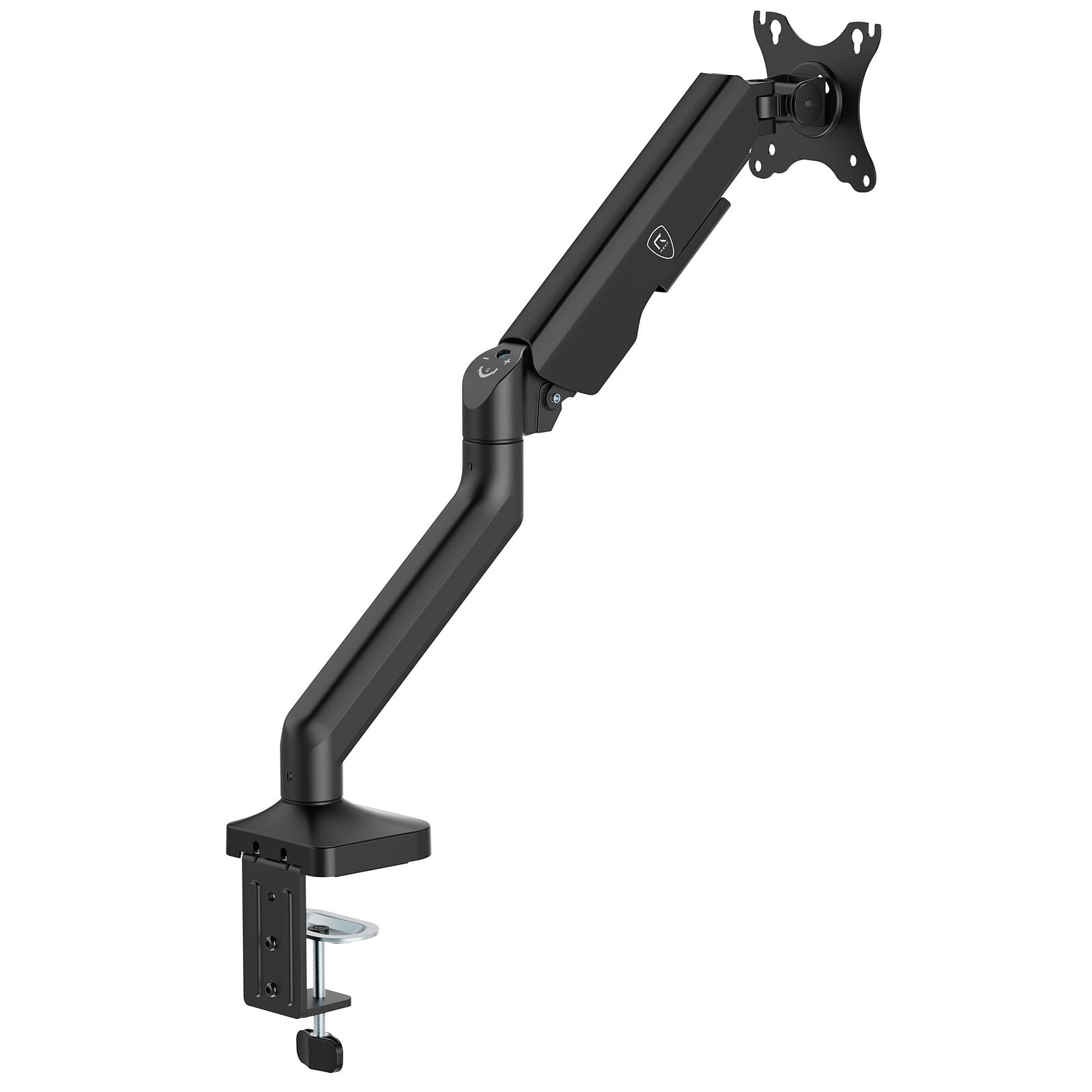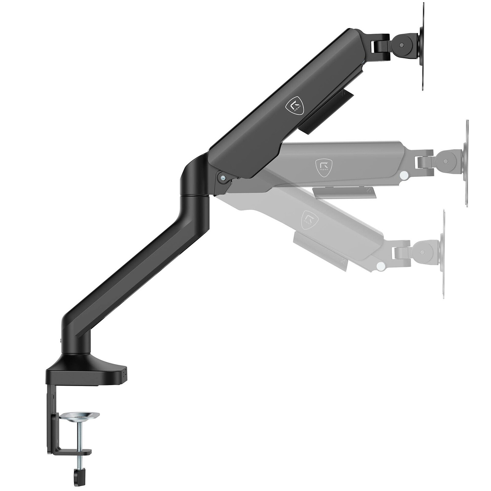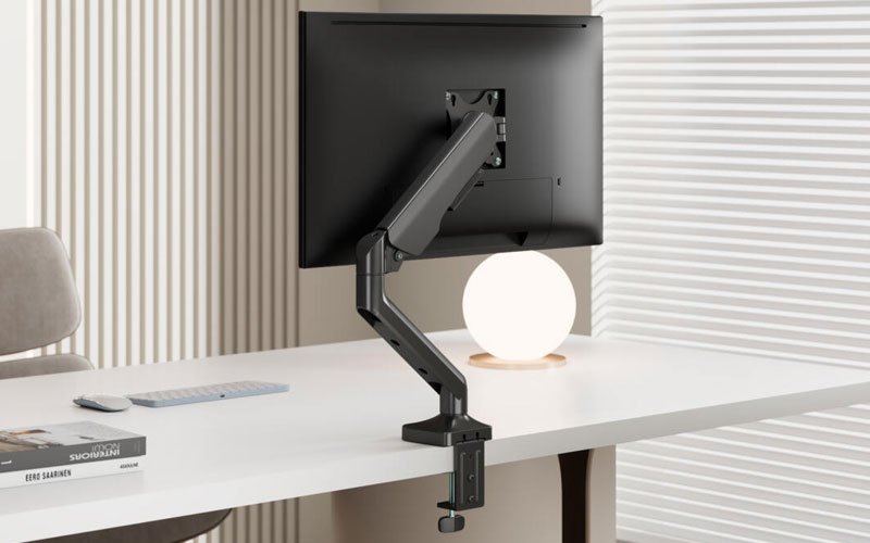 Il braccio è realizzato in robusto metallo per garantire stabilità e durata. È dotato di una regolazione dell'inclinazione da -55° a +90°, di una rotazione di +90°/-90° e di unarotazione completa di 360°, che consentono di orientarsi perfettamente in base all'uso e alla postura. Può essere fissato su scrivanie con spessore fino a 75 mm o attraverso fori larghi fino a 80 mm per una maggiore flessibilità di installazione.