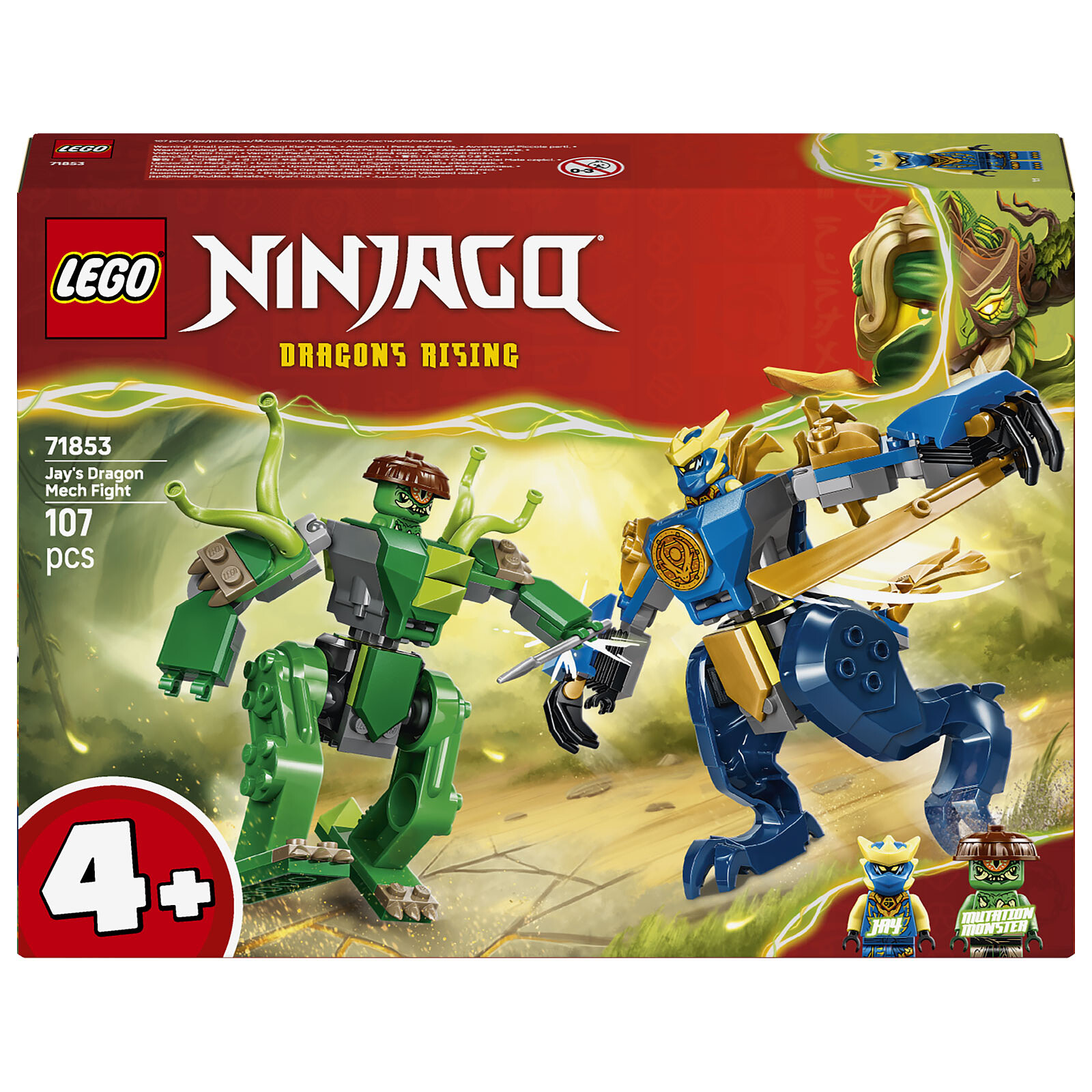 I bambini e le bambine dai 4 anni in su possono imparare a costruire e ricreare le battaglie della stagione 4 della serie TV NINJAGO L'insurrezione dei draghi con La battaglia del drago robot di Jay LEGO NINJAGO (71853), che include 2 robot e 2 minifigure.Il robot drago di Jay ha una cabina di pilotaggio che si apre per la sua minifigure e può muovere la coda, le ali, le braccia, le gambe, il corpo e le dita. Il robot da combattimento del mostro mutante ha una cabina di pilotaggio che si apre per la sua minifigure e può muovere tentacoli, braccia, gambe e torso. Il set include 4 armi intercambiabili che aumentano il suo valore ludico: 2 spade, una lancia e un set di artigli.